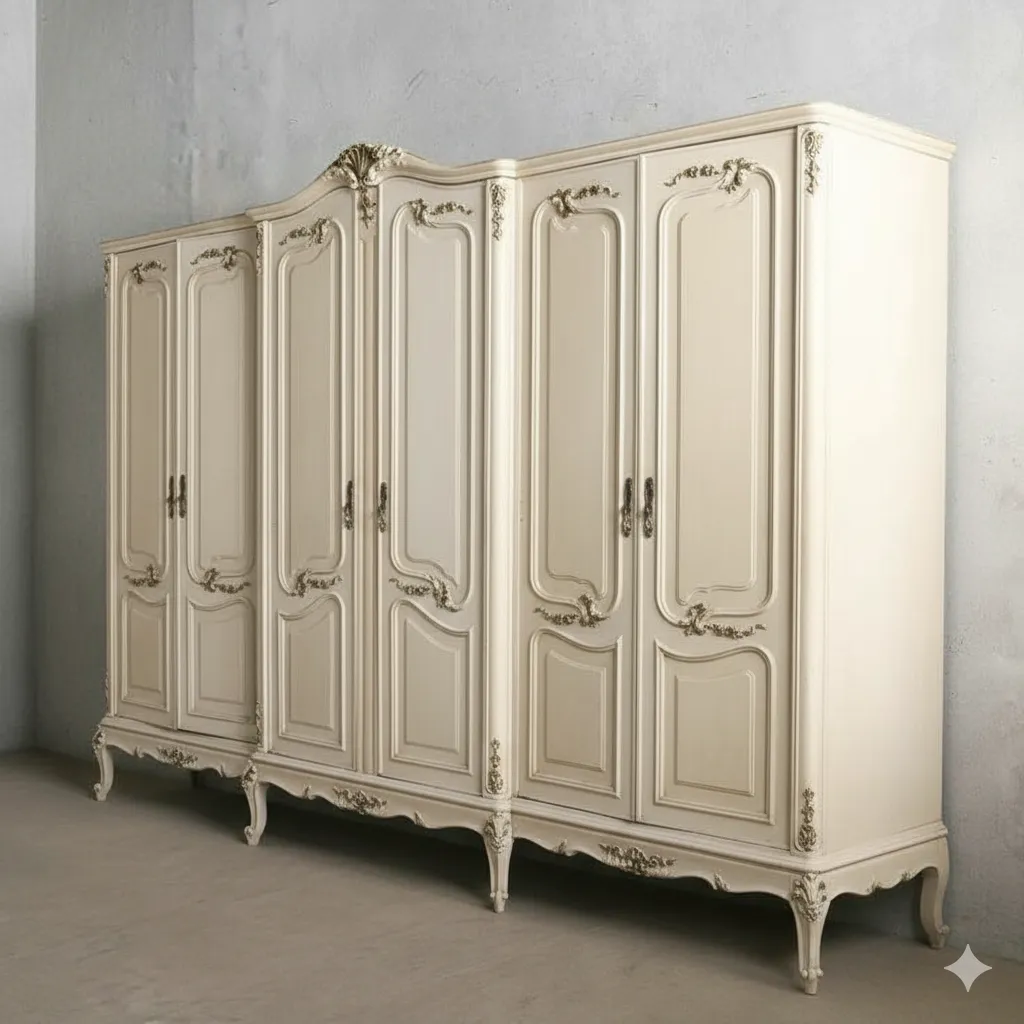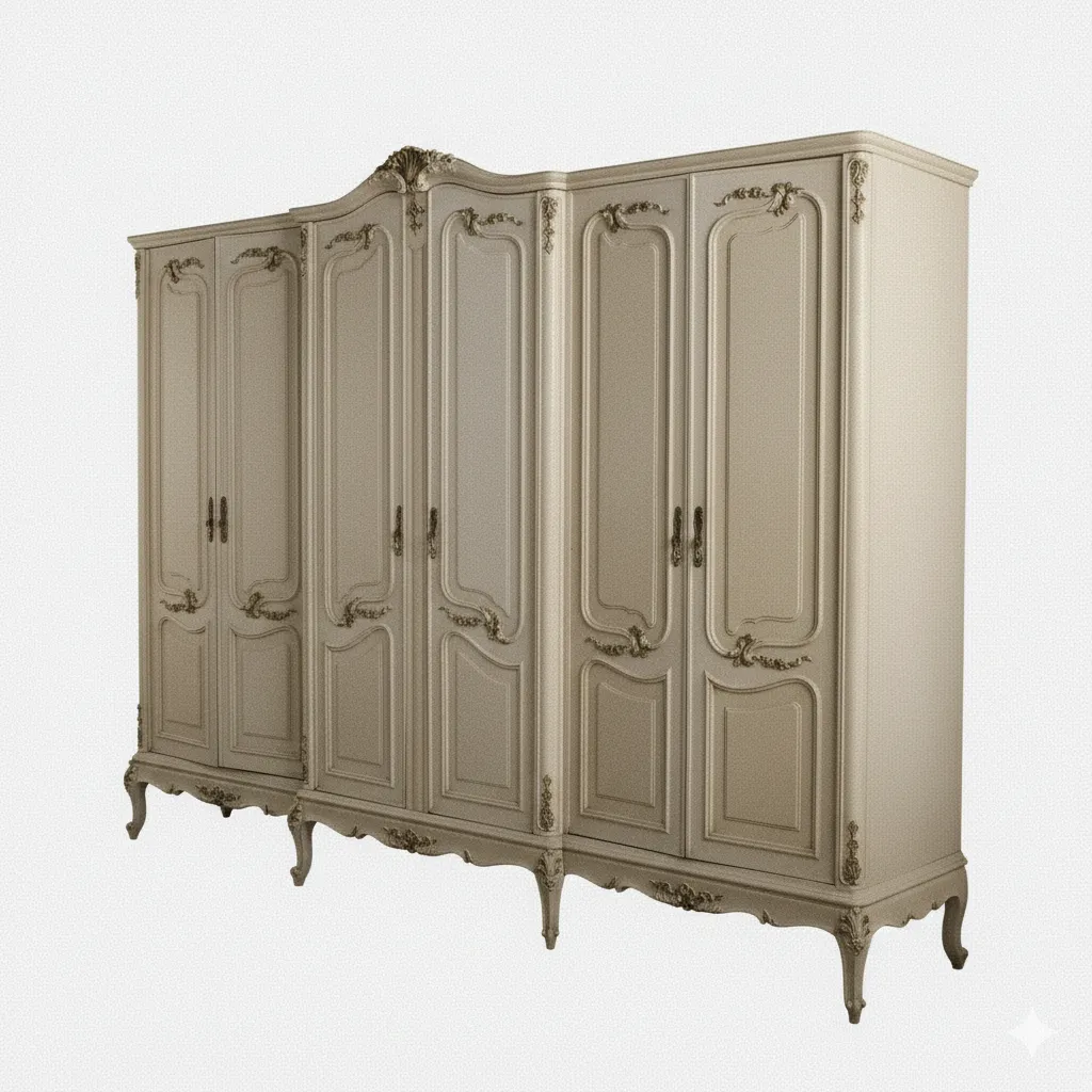أوريليا دولاب ملكي كلاسيك فاخر بتفاصيل دقيقة وزخارف ناعمة مستوحاة من الطراز الملكي الأوروبي. يتميز بتصميم متوازن وأبواب أنيقة تضيف حضورًا قويًا لغرفة النوم، مع تشطيب راقٍ يبرز جمال النقوش والحواف.