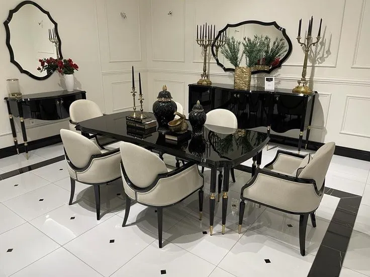 ريڤانا طقم سفرة كلاسيك مودرن أسود يقدم مزيجًا راقياً بين الكلاسيكية الراقية واللمسات المودرن الفاخرة. يتميز بتصميم أسود لامع يبرز التفاصيل الذهبية بدقة عالية، مما يمنح المكان حضوراً قوياً وأنيقاً.