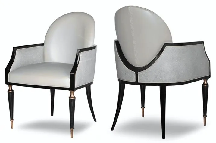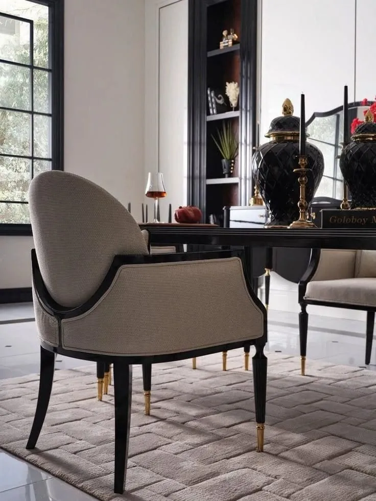الكراسي تأتي بظهر بيضاوي منسدل يوفر راحة مميزة أثناء الجلوس، مع تنجيد فاخر ناعم الملمس مناسب للاستخدام اليومي والضيافة. الأرجل مصنوعة من الخشب الطبيعي، مدعمة بلمسات معدنية ذهبية تزيد من الفخامة والثبات.