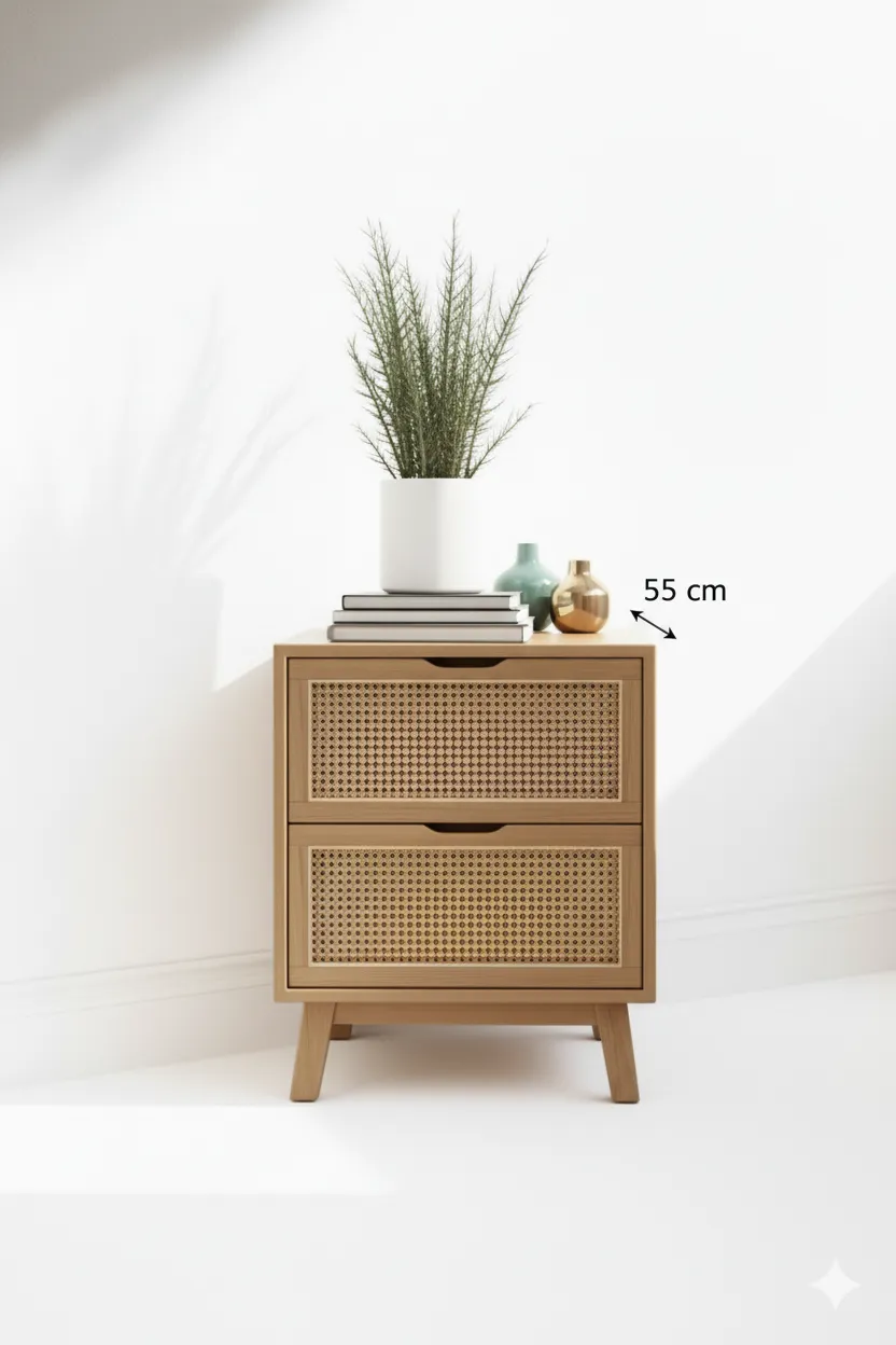 كومود جانبي أنيق من Living بتصميم عصري يجمع بين الخشب الطبيعي ونقشة الراتان المميزة.