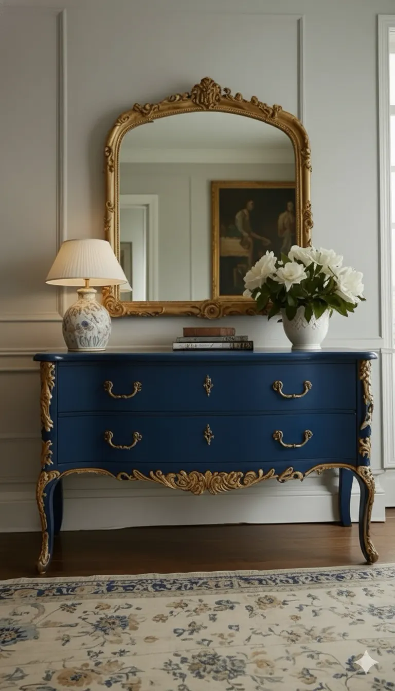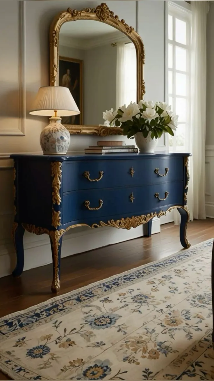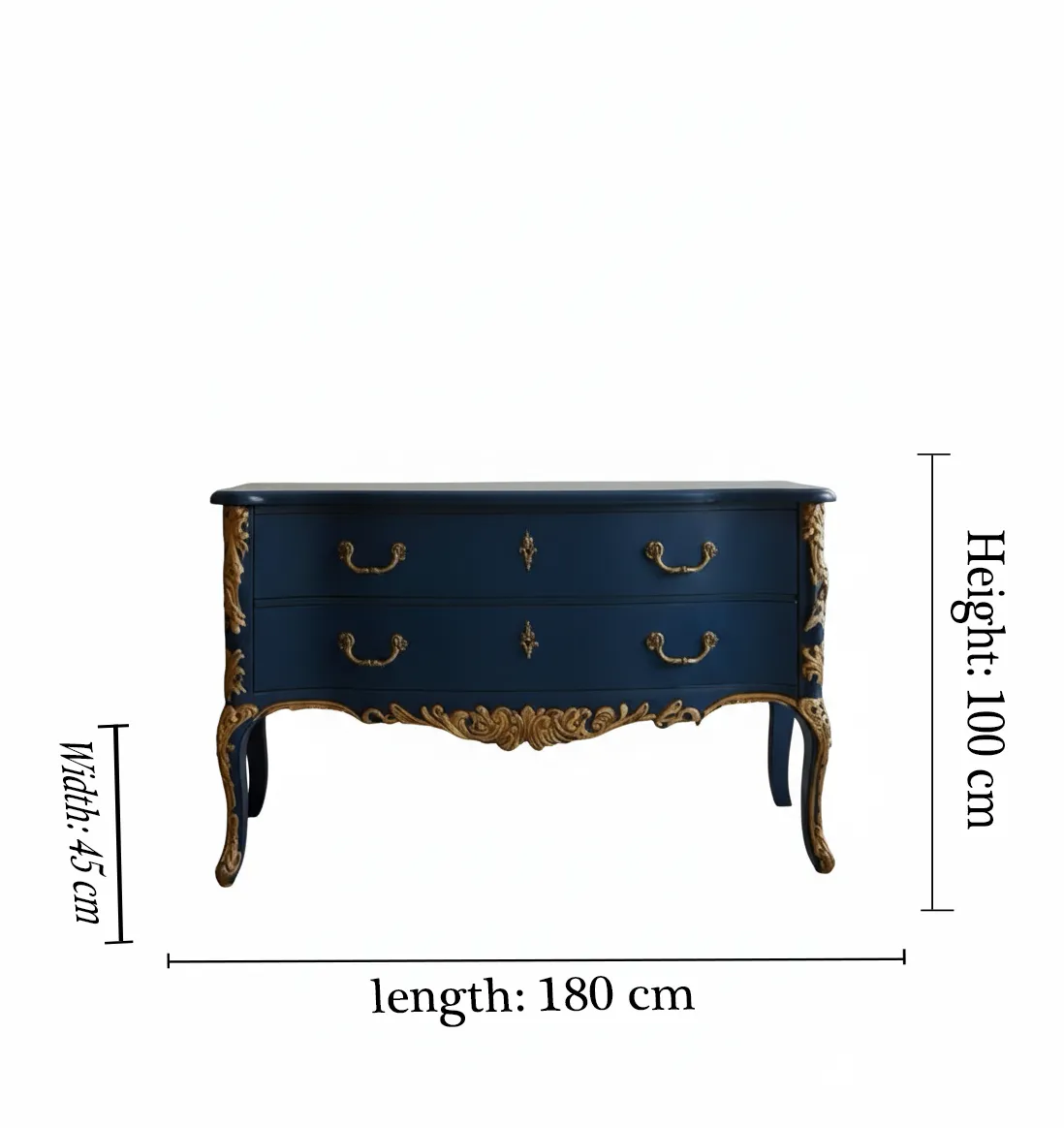 وحدة تخزين بتصميم كلاسيك فاخر باللون الأزرق الملكي مع زخارف ذهبية أنيقة، مثالية لغرف المعيشة والاستقبال.