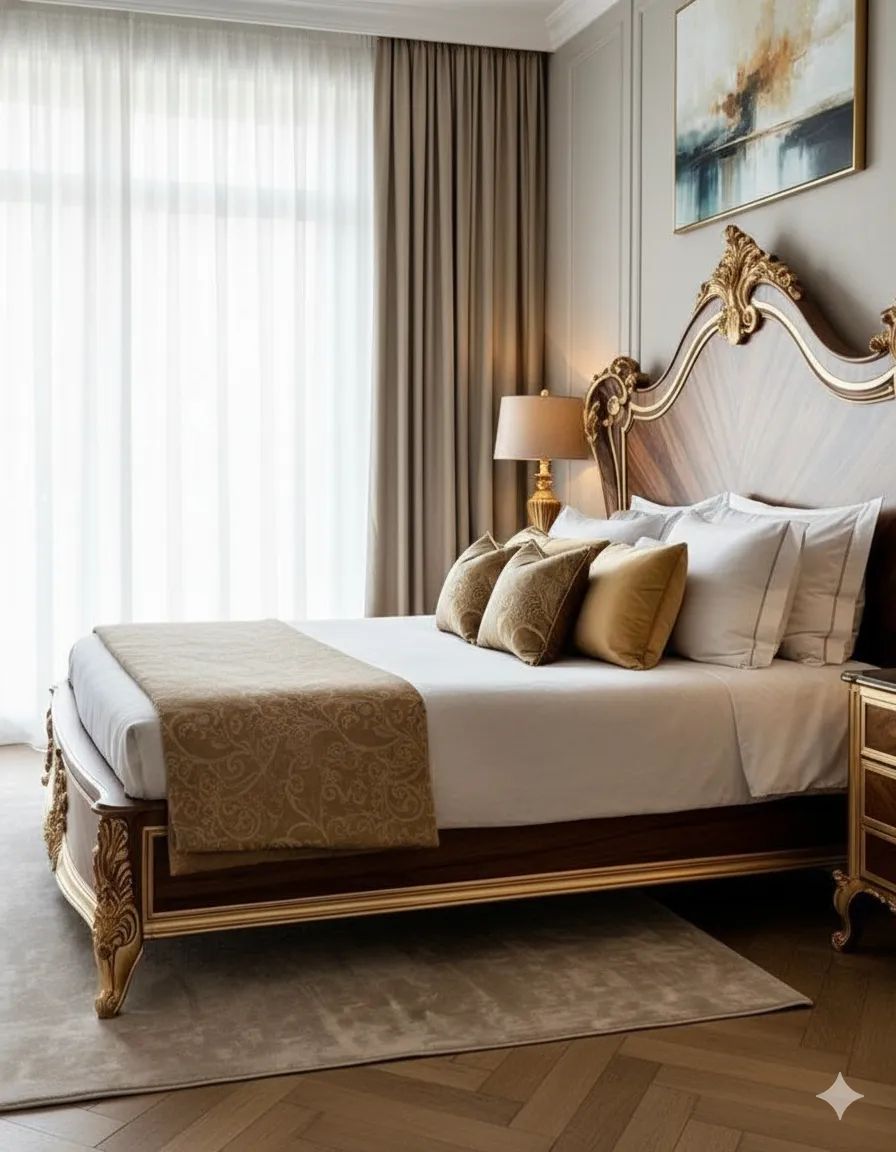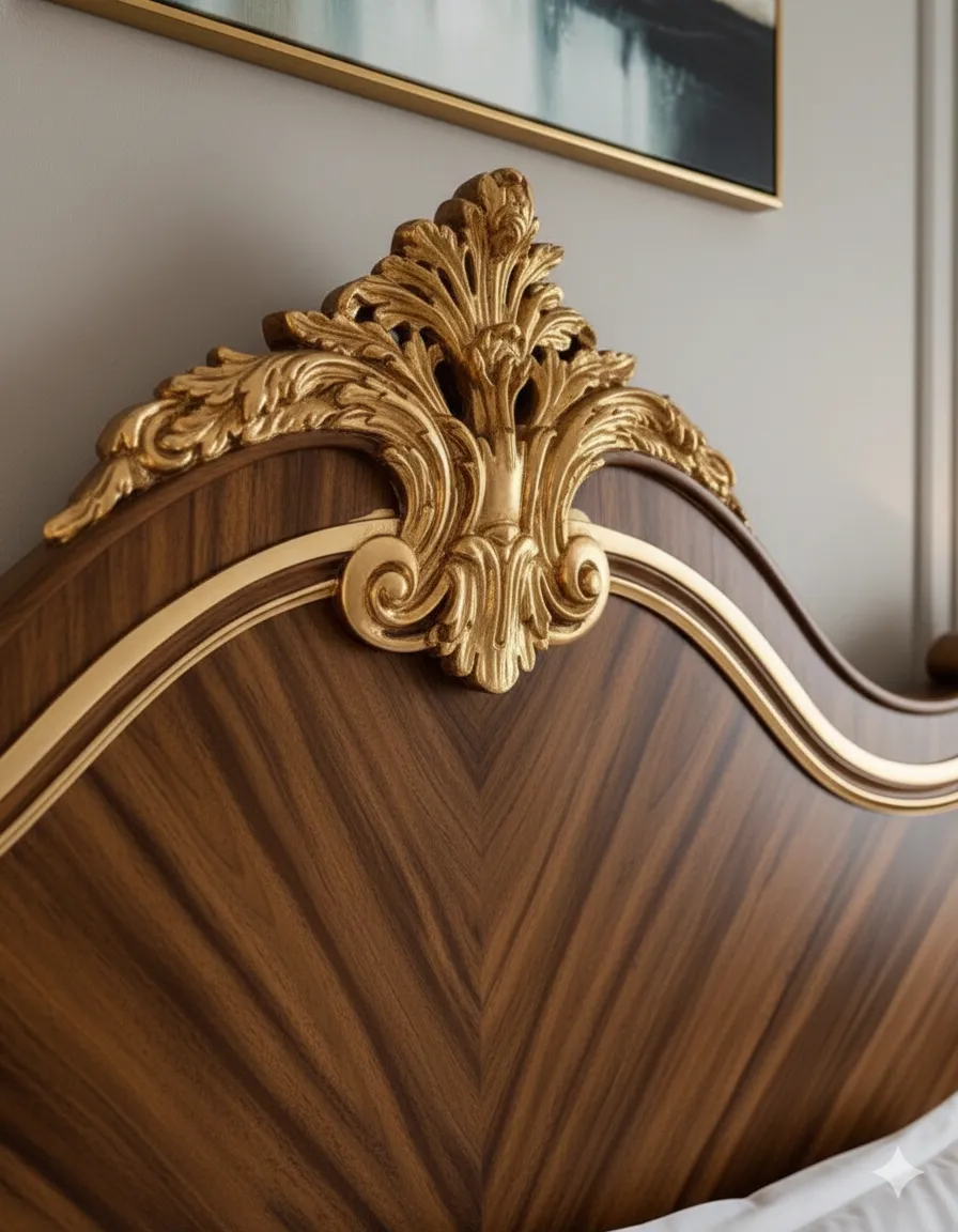 يتميز الهيكل بتشطيبات خشبية غنية مزودة بزخارف مذهّبة منحوته بدقة، مع لوح خلفي مرتفع يمنح تأثيرًا بصريًا مهيبًا وجوًا دافئًا في المساحة.