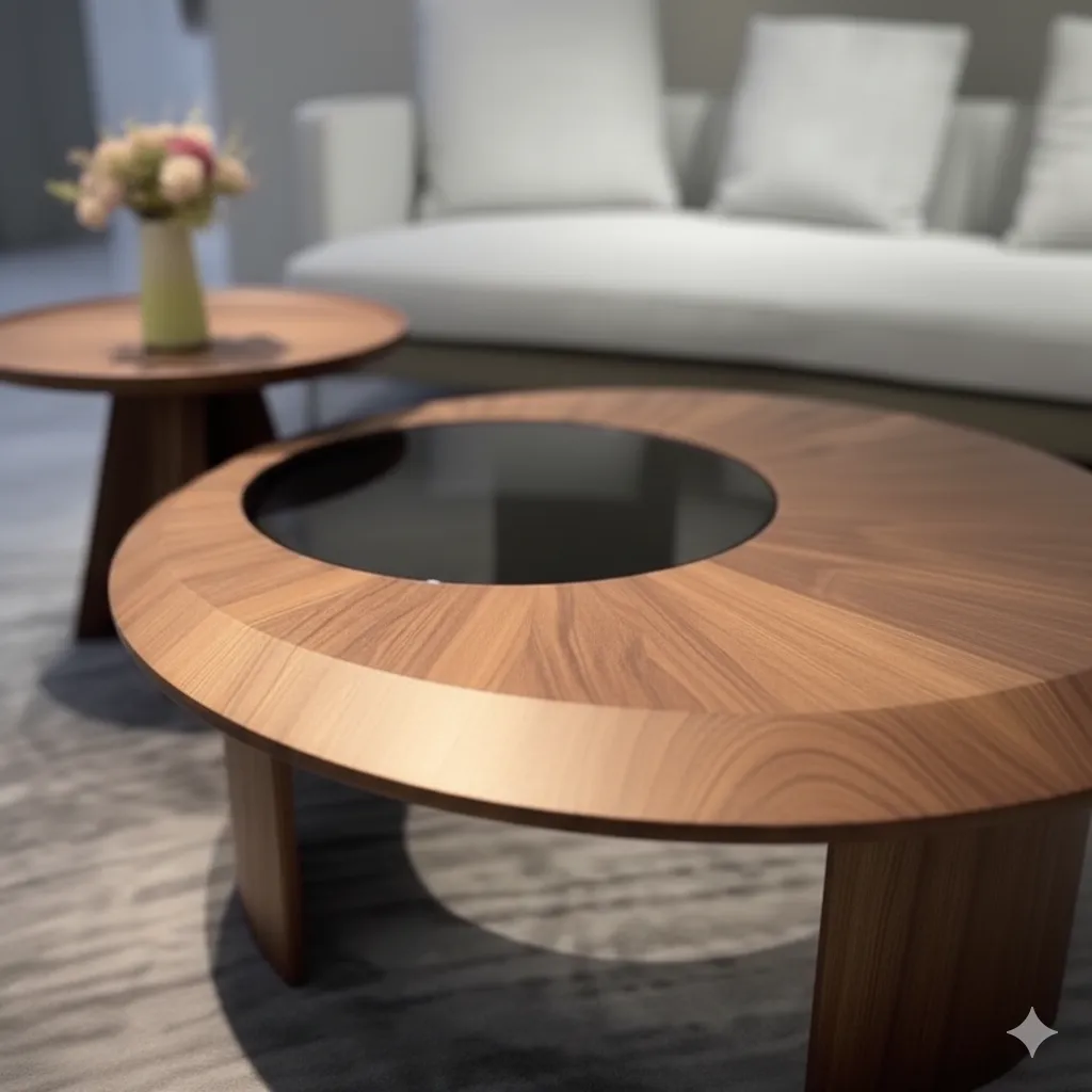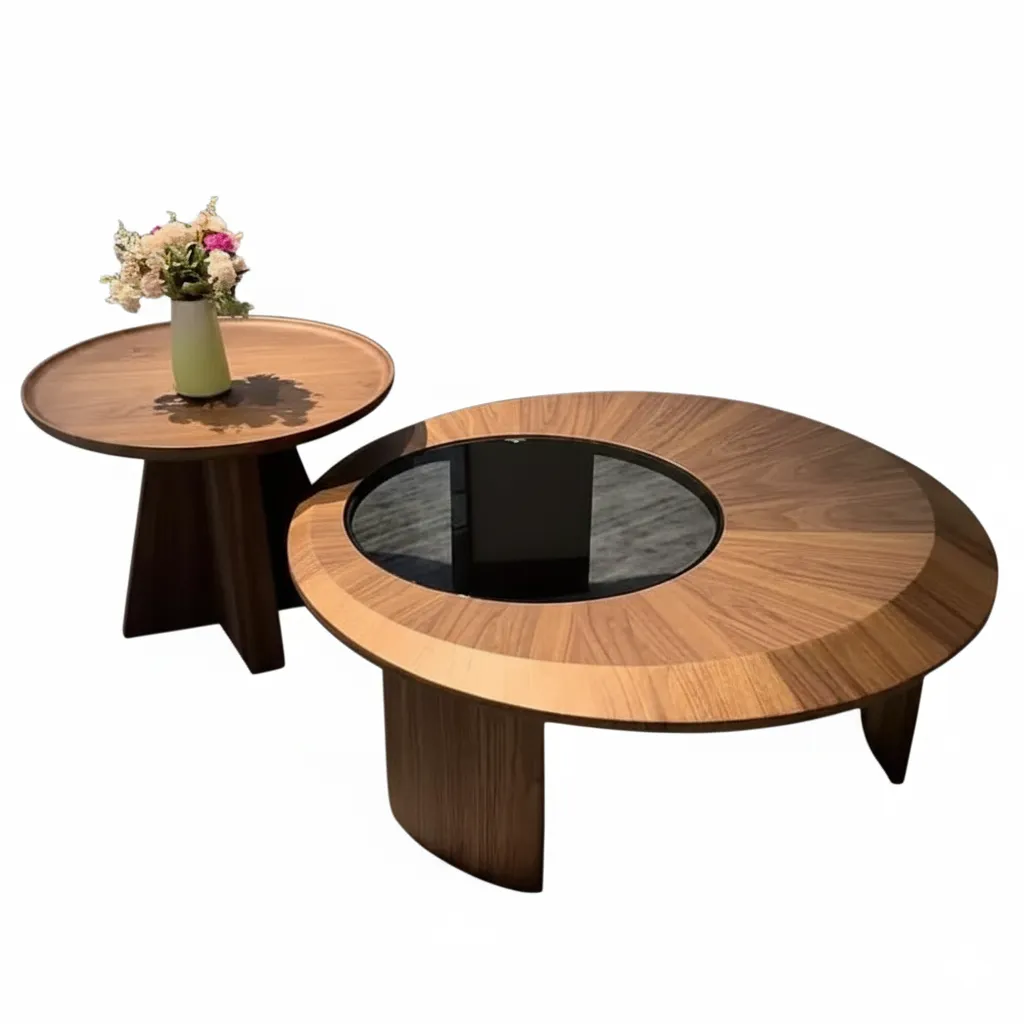 طقم طاولات قهوة مودرن بلمسة أنيقة، مكوّن من قطعتين بتصميم دائري وخشب طبيعي مع سطح زجاجي.