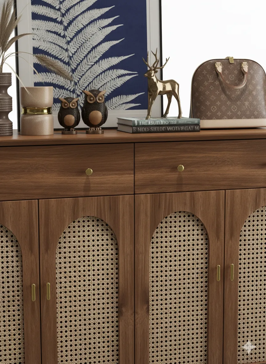 تتميز بخامة خشبية طبيعية تعكس الدفء والأناقة، مع واجهات منسوجة بتفاصيل مقوسة تمنحها مظهرًا فاخرًا ومميزًا.