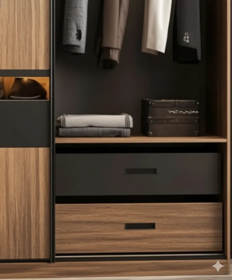 كما تضم أرفف جانبية متعددة الاستخدام لتخزين الملابس المطوية والإكسسوارات، بالإضافة إلى درجين سفليين يوفران مساحة إضافية للحفاظ على الأشياء بشكل مرتب وسهل الوصول إليه.