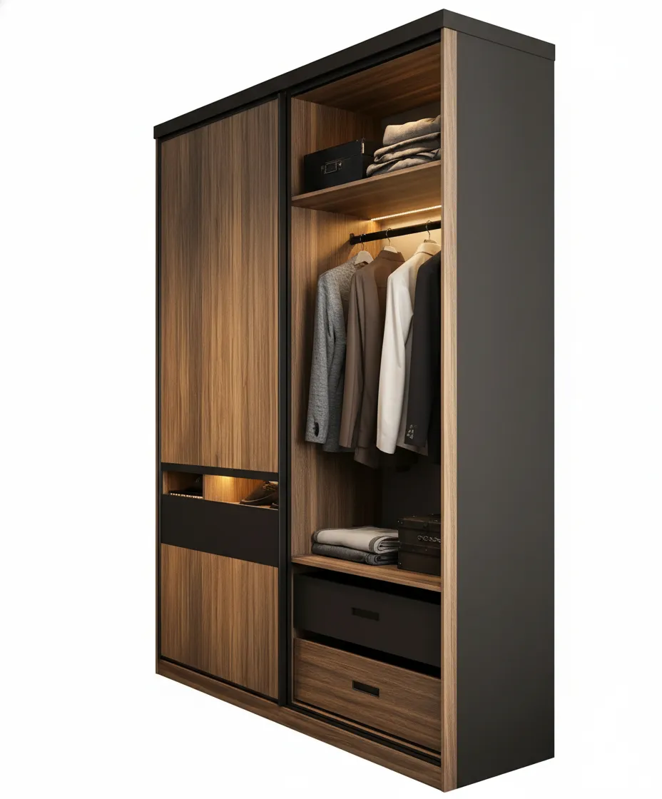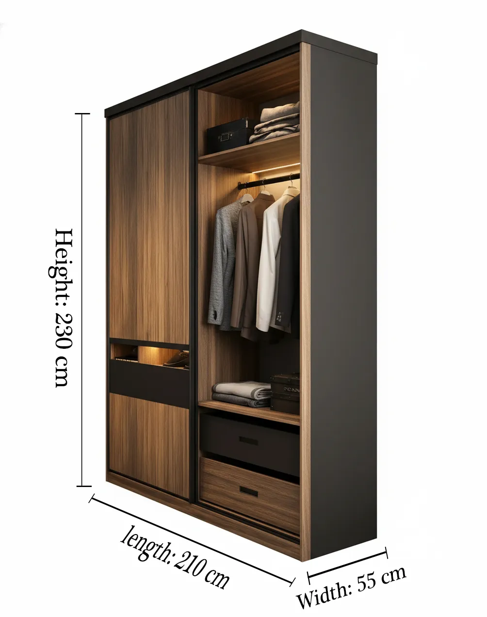 تأتي الخزانة بمساحة تعليق كبيرة مع إضاءة داخلية تضيف رؤية أوضح وتنظيم أفضل للملابس اليومية.