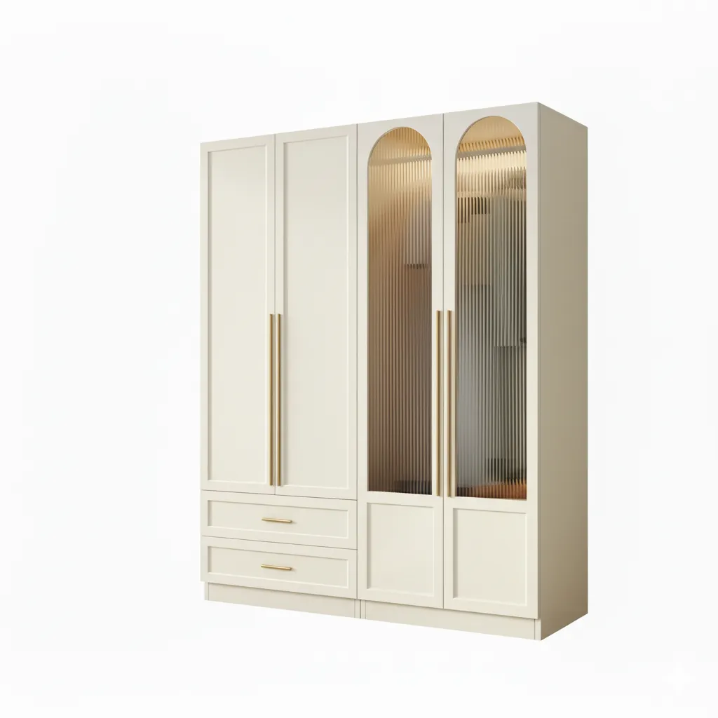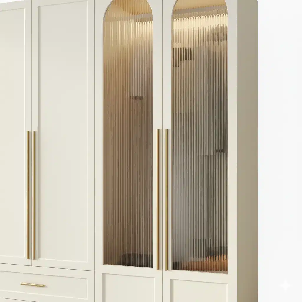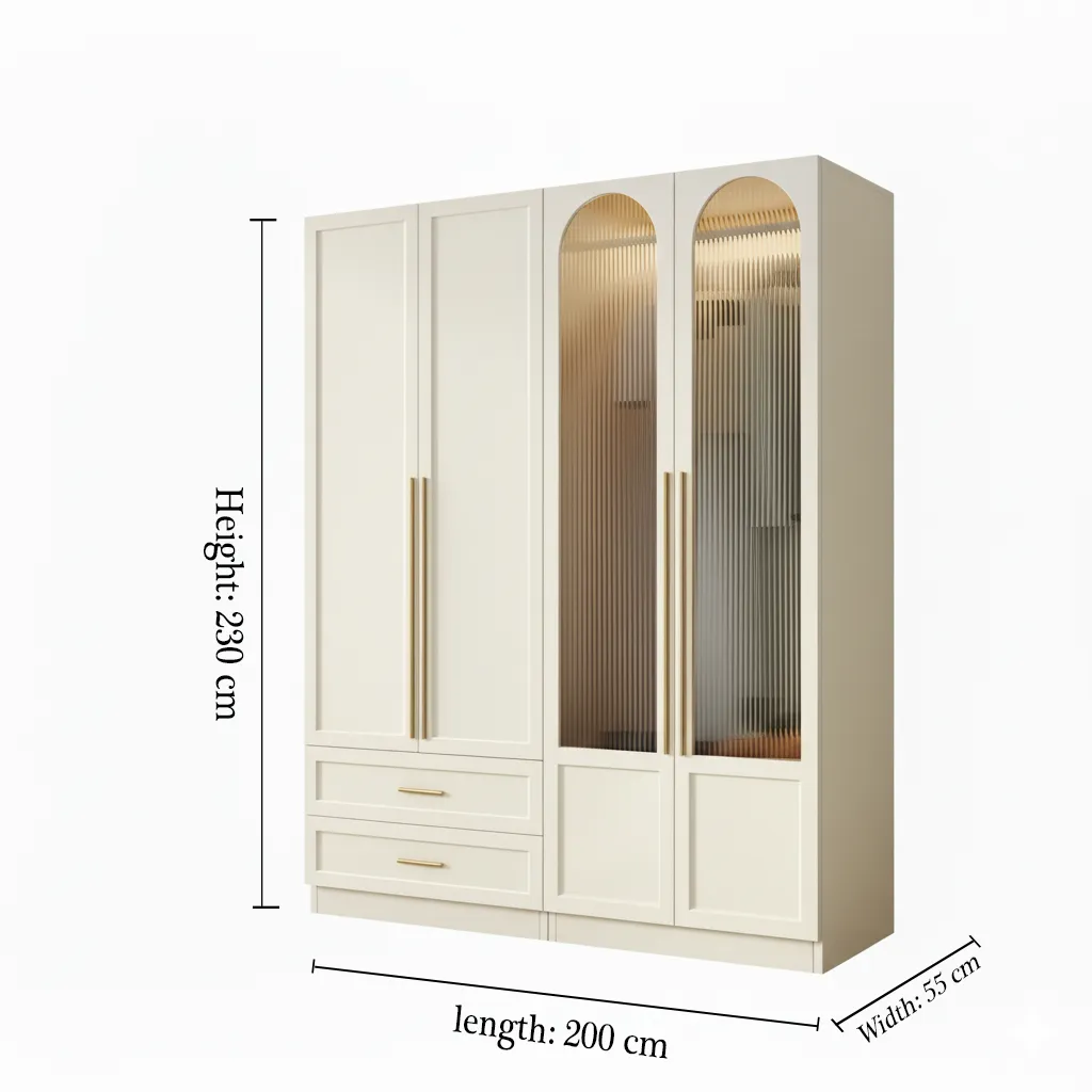 أورليفا خزانة أبواب مقوسة زجاجية فاخرة تجمع بين الفخامة العصرية واللمسات الكلاسيكية الراقية، بتصميم مقوس مميز وواجهات زجاج مموج تعكس الإضاءة الداخلية بشكل جذاب. تأتي بدرجين سفليين ومساحات تخزين واسعة تسمح بترتيب الملابس والإكسسوارات بعناية، مع أبواب طويلة بمقابض ذهبية تضيف لمسة فاخرة.
