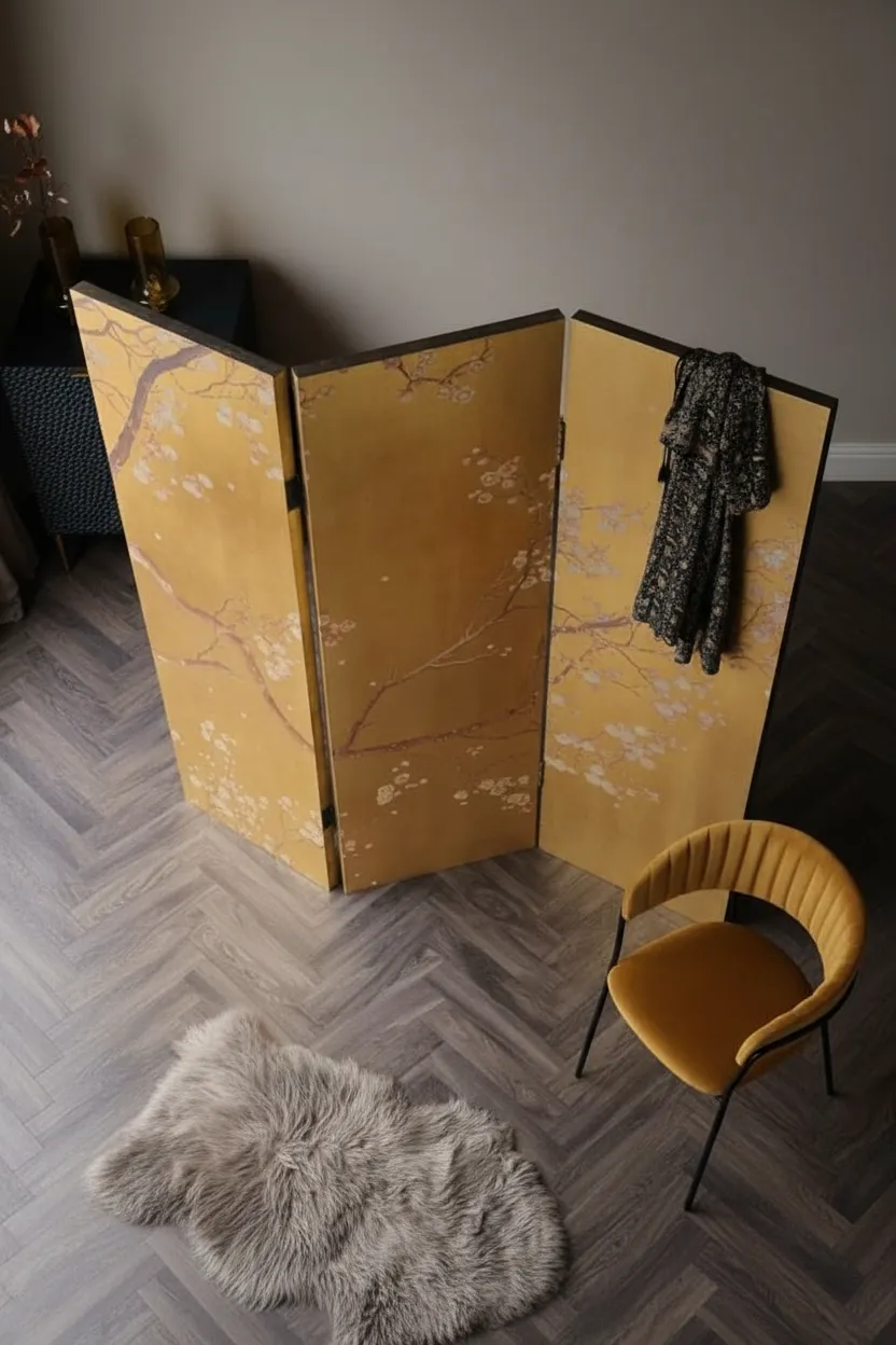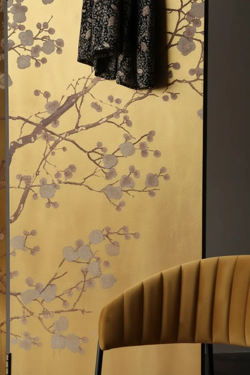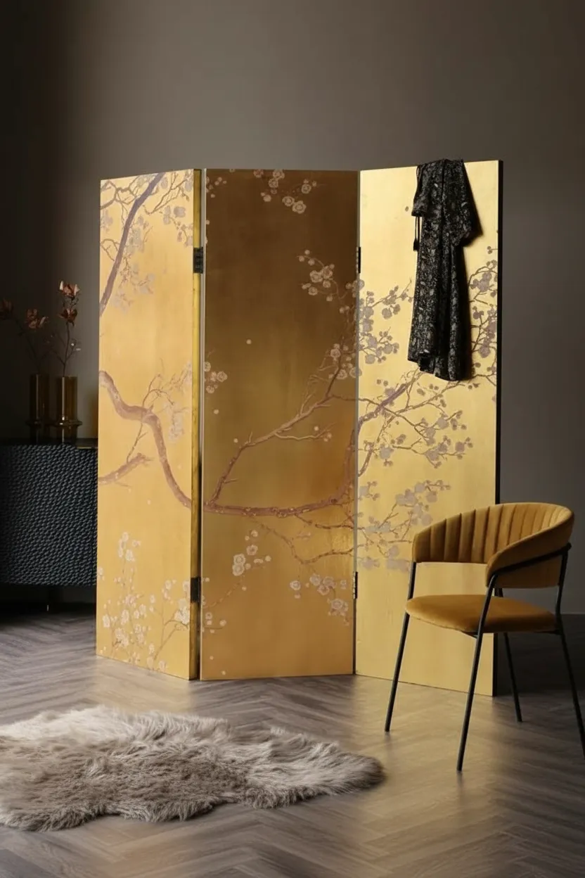 برافان ذهبي فاخر بنقوش يابانية مستوحاة من الطبيعة، يمنح غرفتك لمسة فنية دافئة وفصلًا أنيقًا للمساحة.