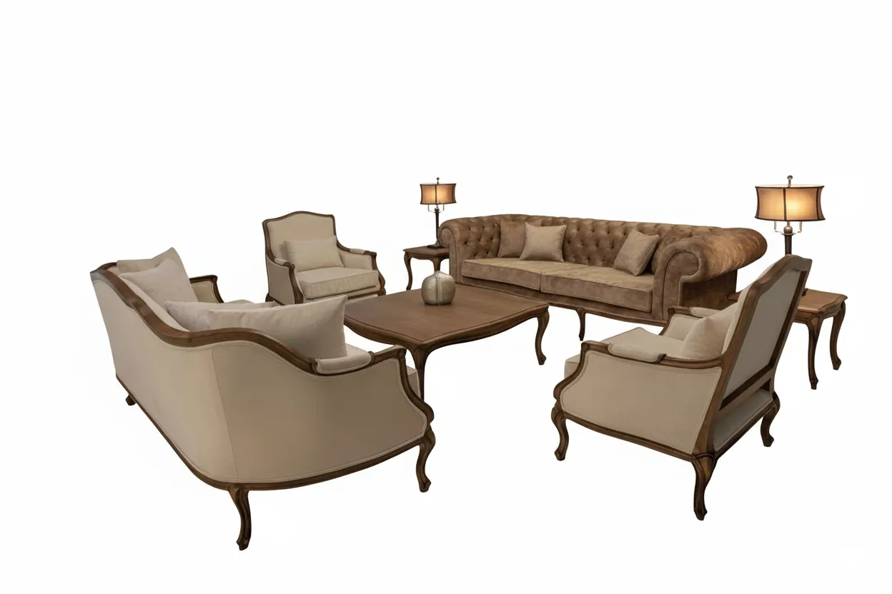 طقم صالون كلاسيك فاخر بتصميم أنيق يجمع بين الراحة والفخامة، مثالي للصالات الراقية والاستقبالات الرسمية.