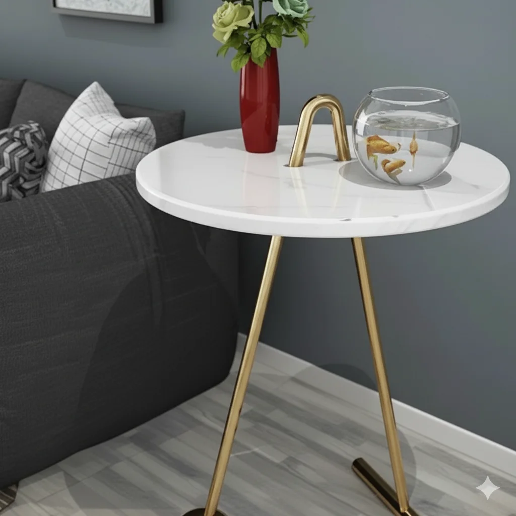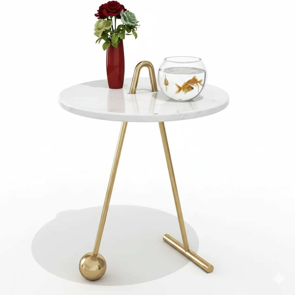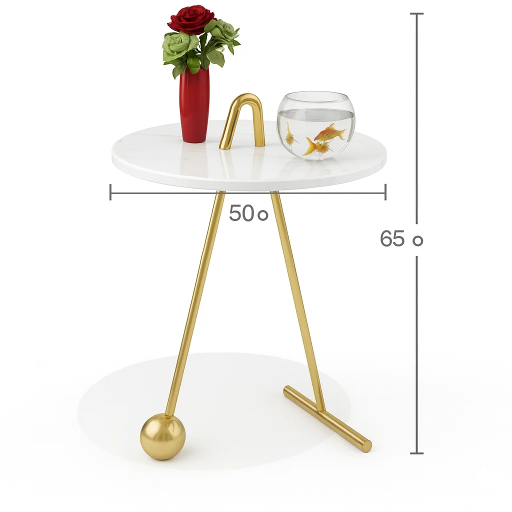 تتميز بسطح دائري من الرخام الأبيض اللامع مع قاعدة من المعدن الذهبي المصقول بتصميم غير تقليدي بثلاث أرجل مختلفة في الشكل، إحداها تنتهي بكُرة زخرفية تضفي لمسة فريدة.