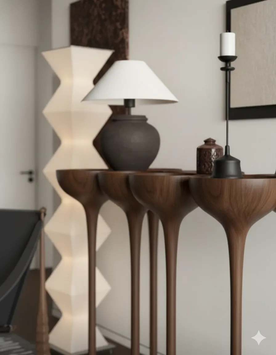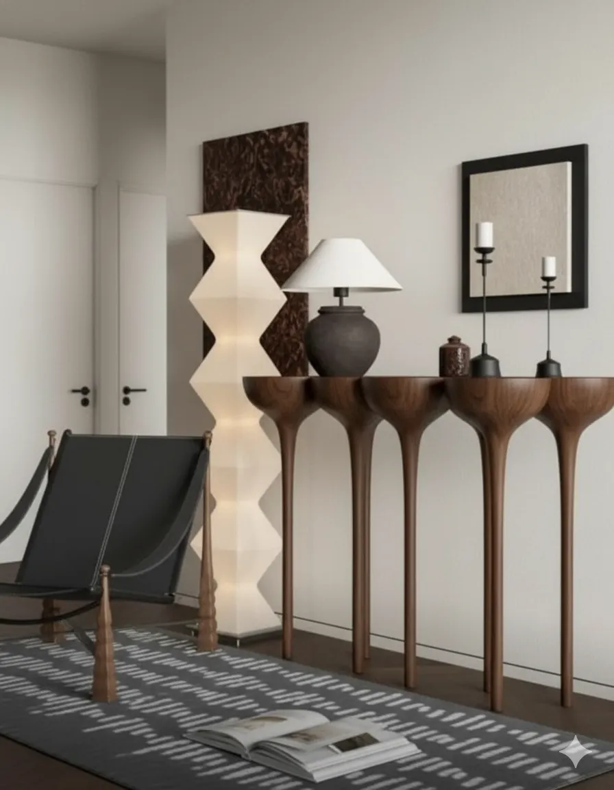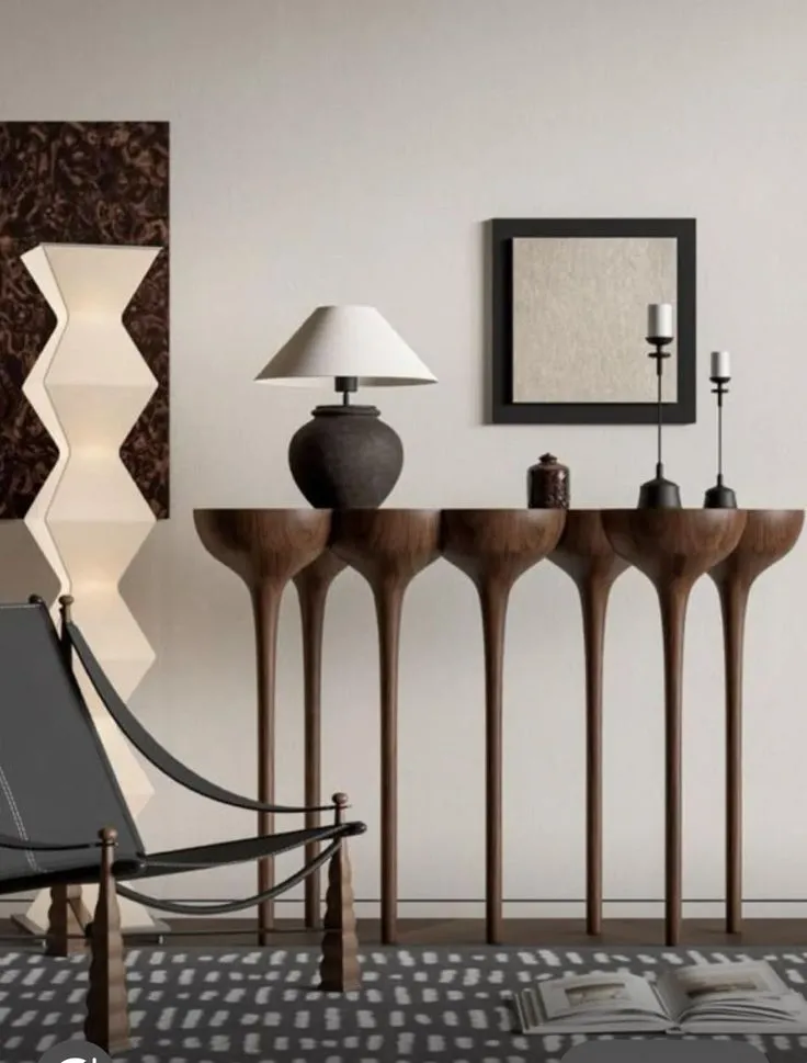 أوزيريس كونسول خشبي فاخر بتصميم نحتي رفيع يرتكز على أرجل طويلة انسيابية تضيف لمسة فنية للمكان.