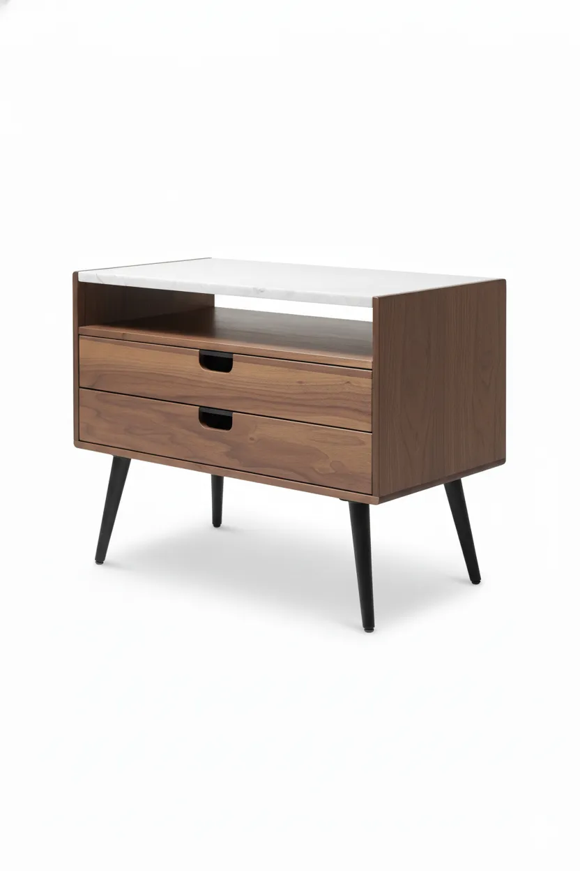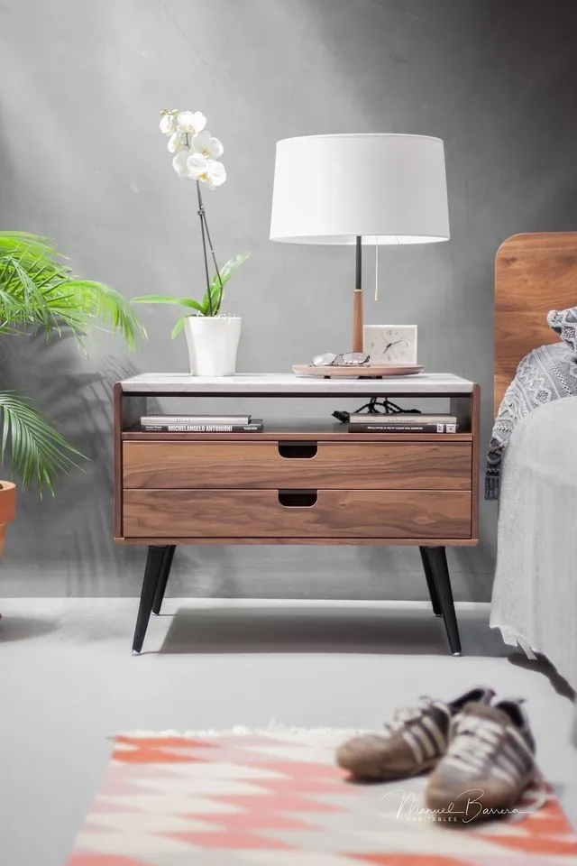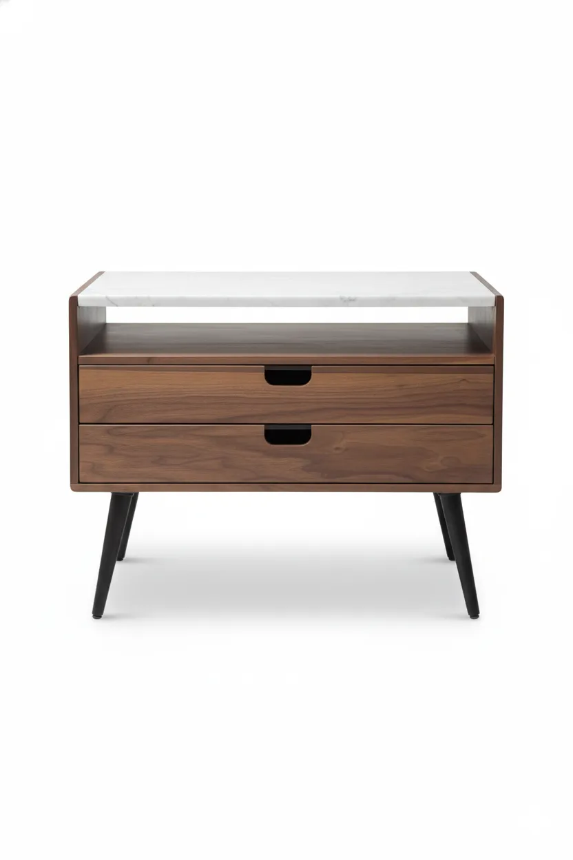 إليريا كومود جانبي رخامي مودرن من Living بتصميم يجمع بين خشب طبيعي راقٍ وسطح رخامي أنيق، عملي ومثالي لغرف النوم.