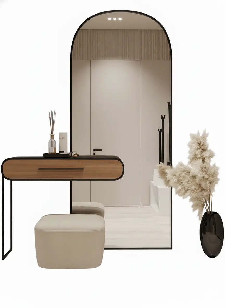 استمتعي بتصميم عملي وفخم مع جزامة إلين من Living ، التي تجمع بين المرآة القوسية الكبيرة لتوسيع الإحساس بالمكان ووحدة تخزين أنيقة تحافظ على ترتيب الأحذية والإكسسوارات اليومية.