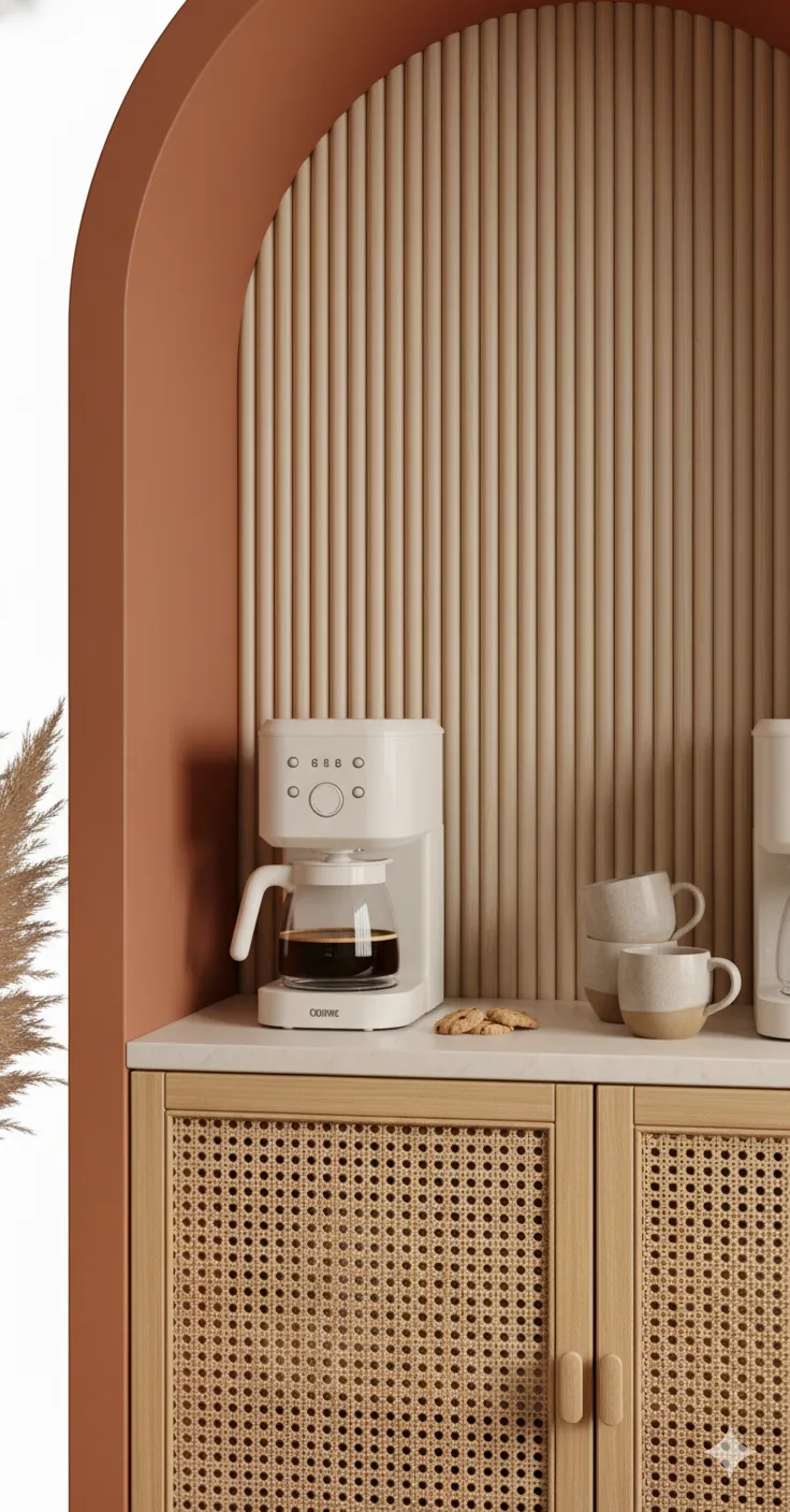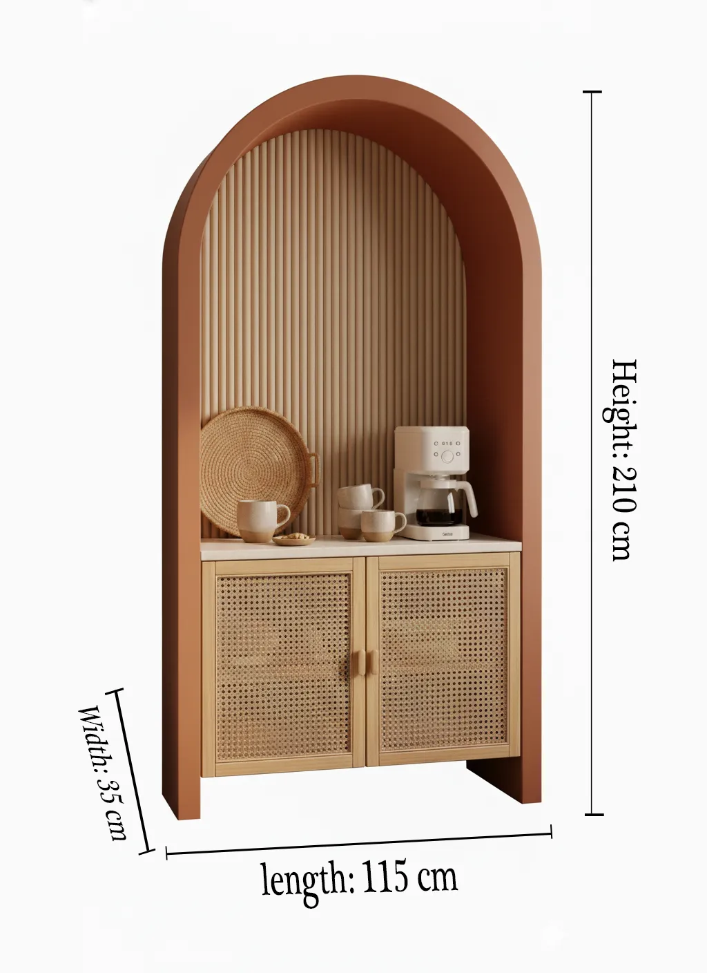 تأتي الخزانة السفلية بواجهات من خامة الروطان الطبيعي، ما يضيف لمسة بوهو مميزة ويساعد في الحفاظ على ترتيب الأدوات بعيدًا عن الفوضى. كما يمنحك السطح العلوي مساحة واسعة لوضع ماكينة القهوة والأكواب، بينما تضيف الخلفية الخشبية العمودية إحساسًا بالفخامة والارتفاع.