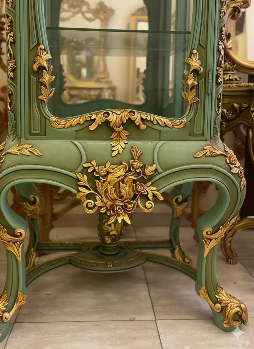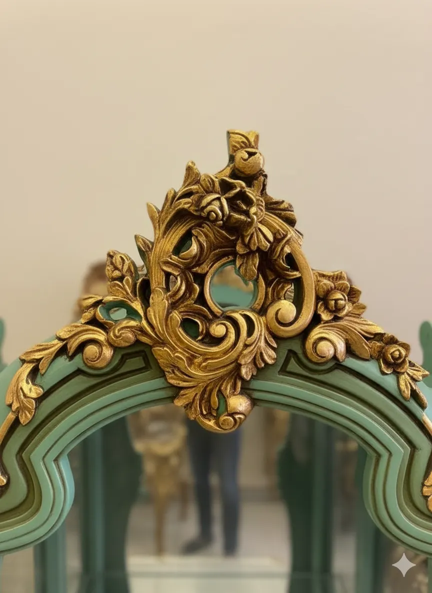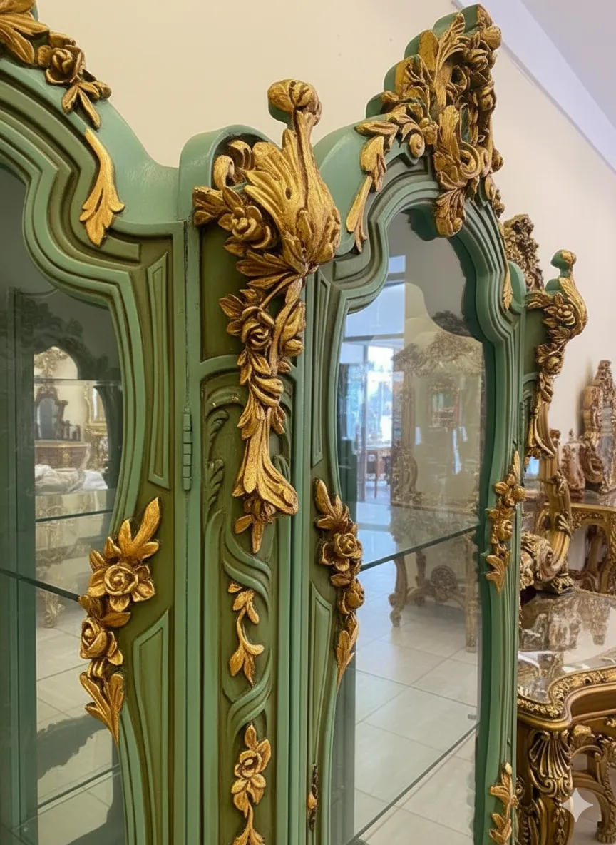 نيش فاخر بتصميم أوروبي كلاسيك، يجمع بين اللون الأخضر الهادئ والزخارف الذهبية اليدوية ليمنح مساحتك لمسة ملكية راقية.