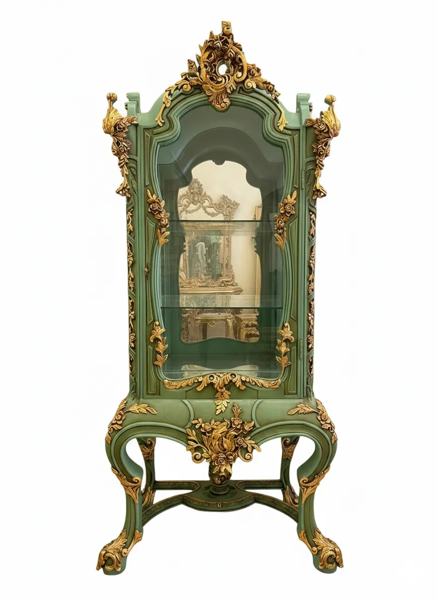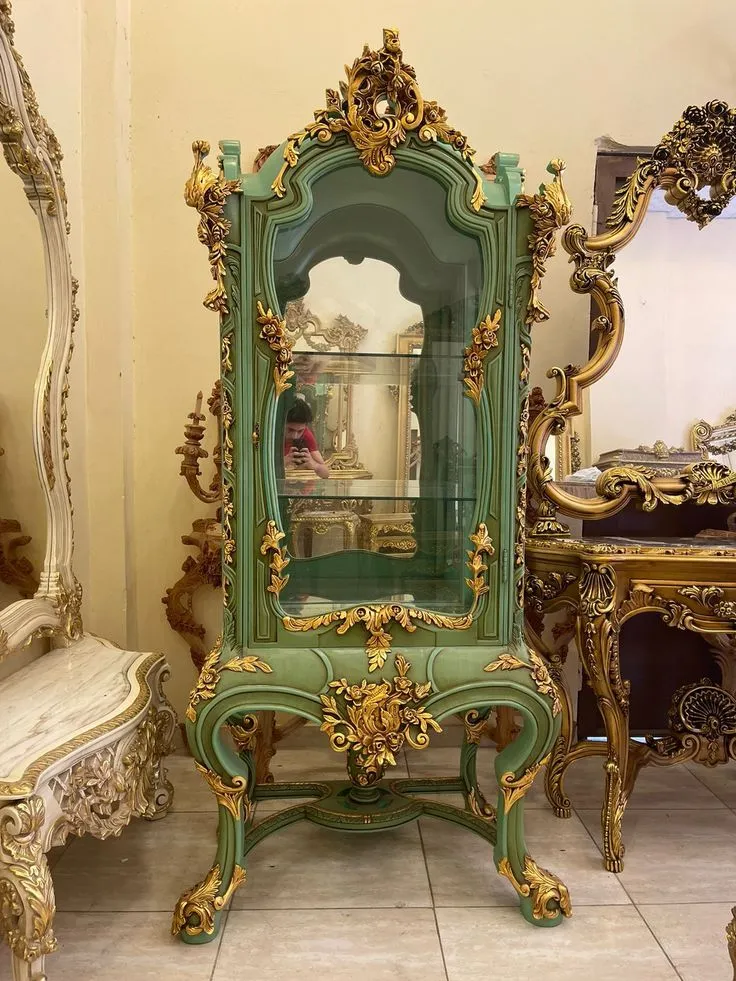 الإطار الخشبي المطلي بلون أخضر أنيق يتناغم مع الزجاج الشفاف ليعرض المقتنيات والتحف بشكل راقٍ، مما يجعله خيارًا مثاليًا لغرف السفرة، الريسبشن الفخم، أو الصالونات الكلاسيك.