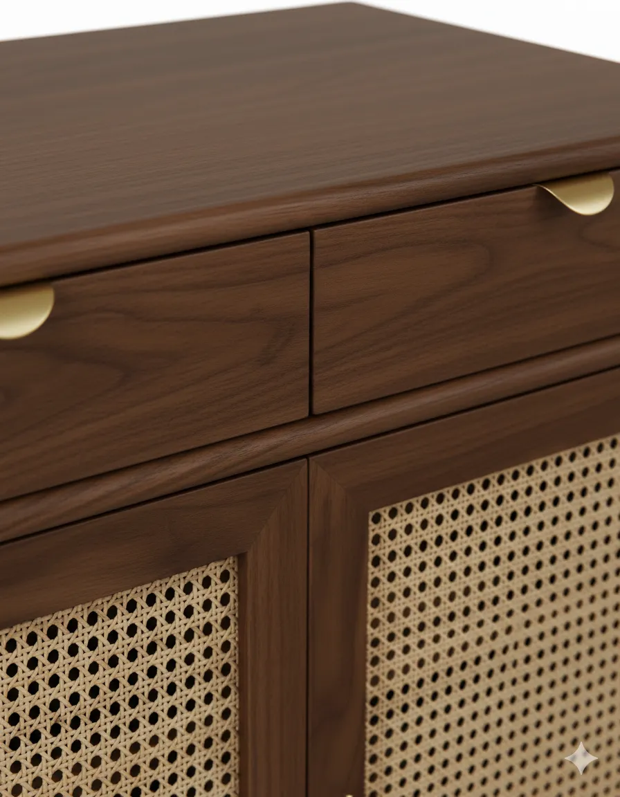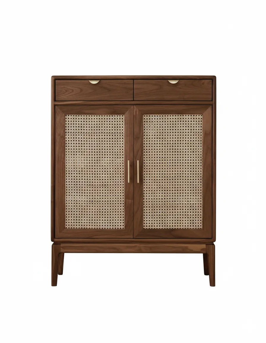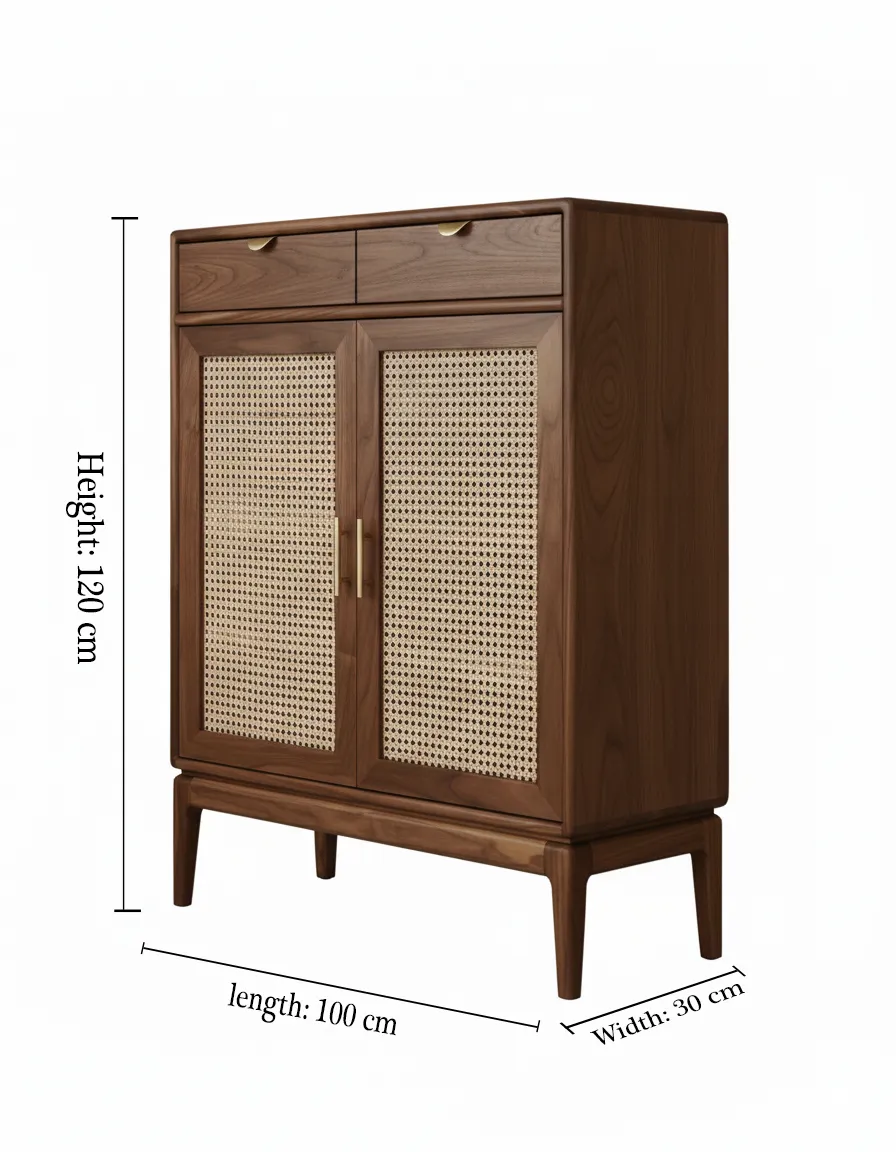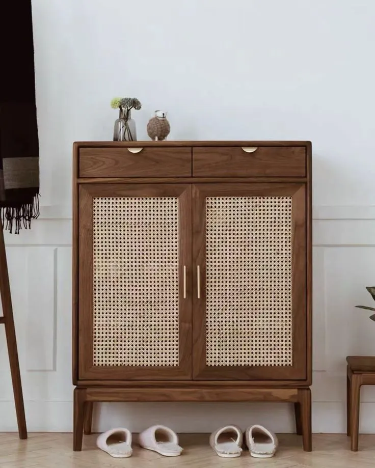 تحتوي على درجين علويين وأبواب راتان مزدوجة لتخزين الأحذية والإكسسوارات، مع أرجل مرتفعة تسهّل التنظيف وتعطي لمسة خفيفة وأنيقة.