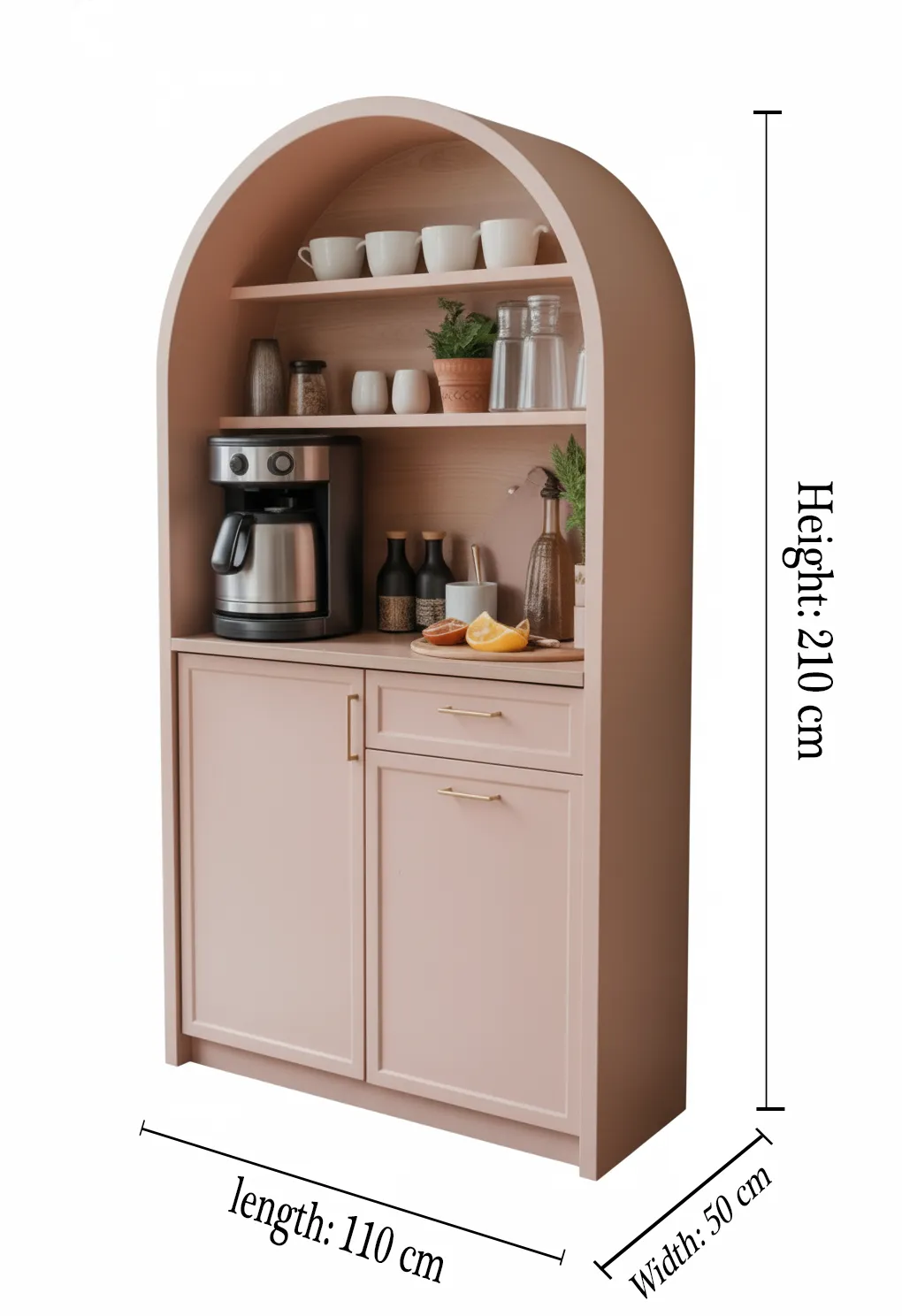 يأتي بتصميم نصف قوسي يضفي أناقة على أي مساحة داخل المنزل، مع رفوف مفتوحة لتنظيم الأكواب والديكورات، إضافة إلى سطح عملي لوضع ماكينة القهوة، وخزانة سفلية واسعة لتخزين الأدوات.