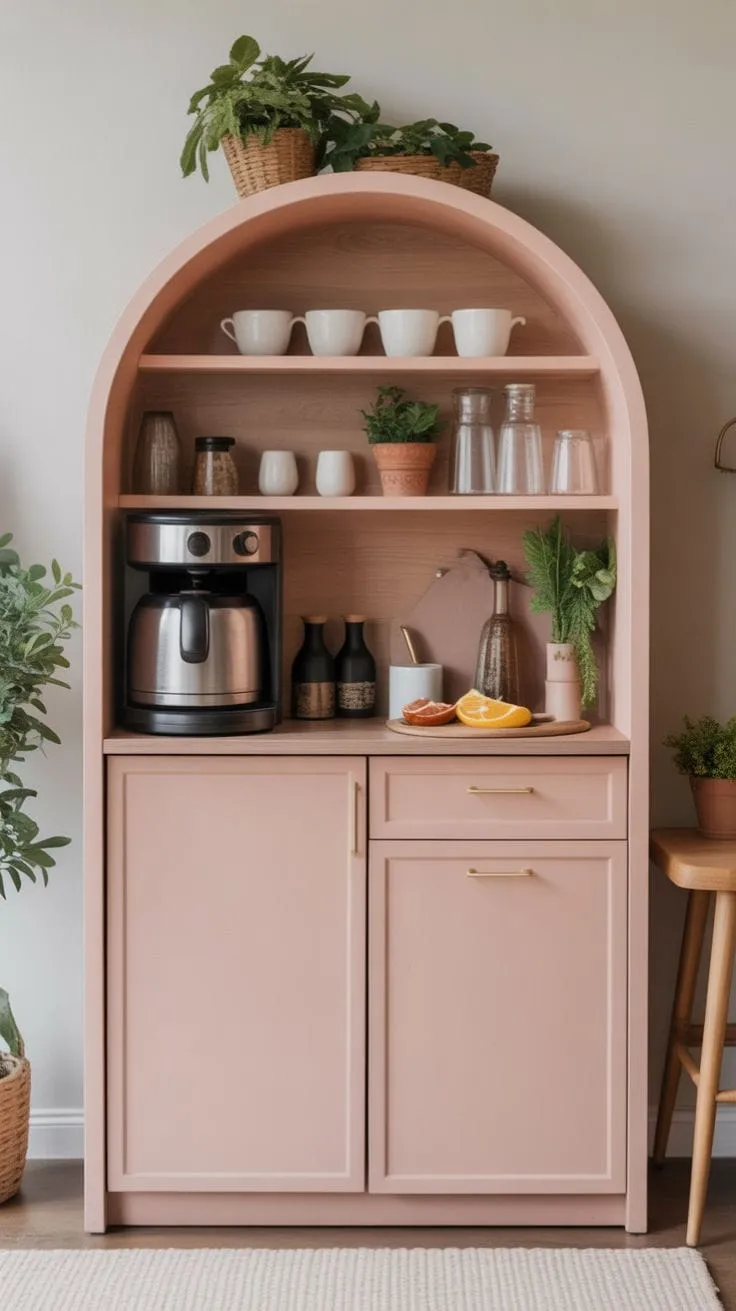 روزيّا ركن قهوة بيضاوي بلون الباستيل الأنيق يناسب المساحات الحديثة، مزود برفوف تخزين علوية ومساحة عمل عملية.