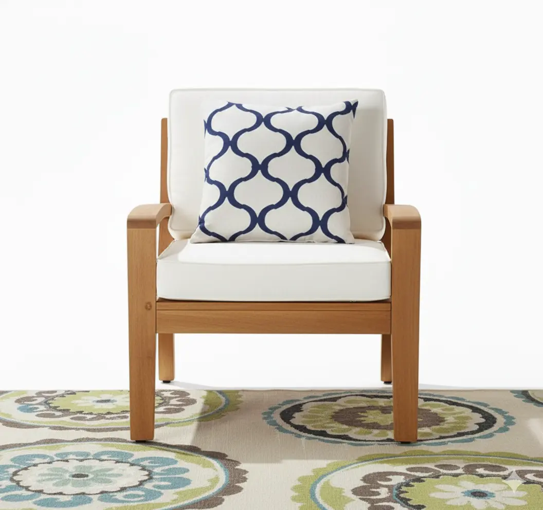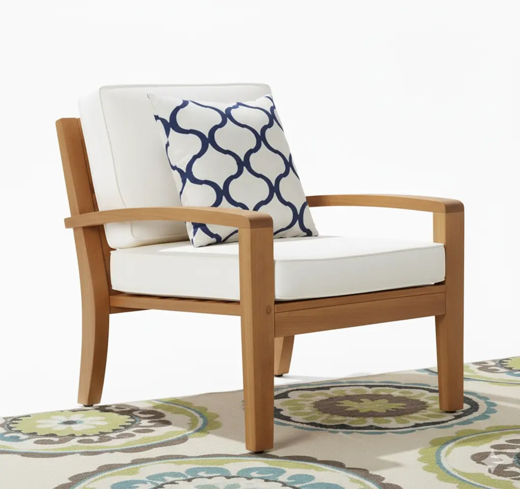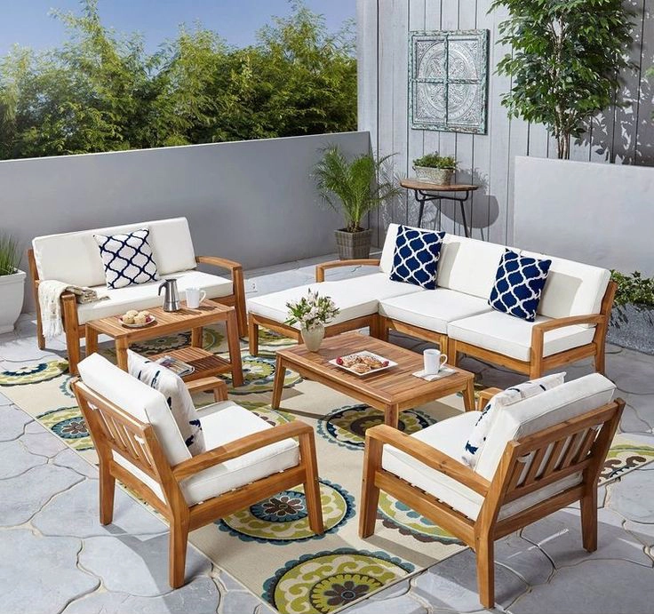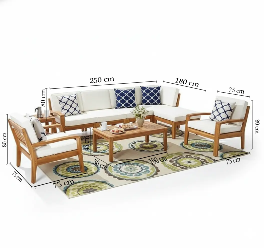 ريفيرا طقم خارجي أنيق مكوَّن من 6 قطع (كنبة ركنية + كرسيين + طاولة قهوة + طاولة جانبية). تصميمه العصري من الخشب الطبيعي مع وسائد بيضاء مريحة يضيف لمسة فخامة ودفء لأي حديقة أو تراس.