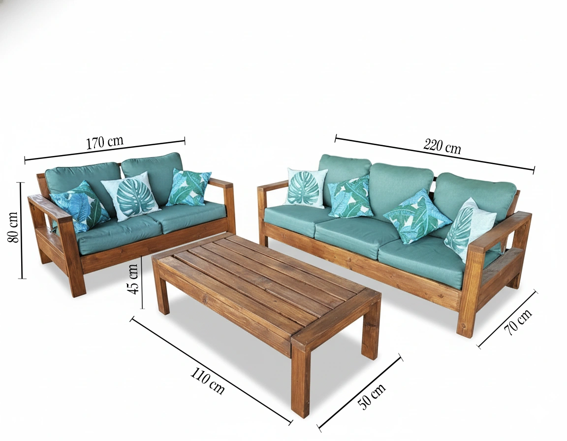 سافوي من LIVING هو طقم أثاث خارجي أنيق يجمع بين الخشب الطبيعي الدافئ والمقاعد المبطنة باللون الأخضر الهادئ.