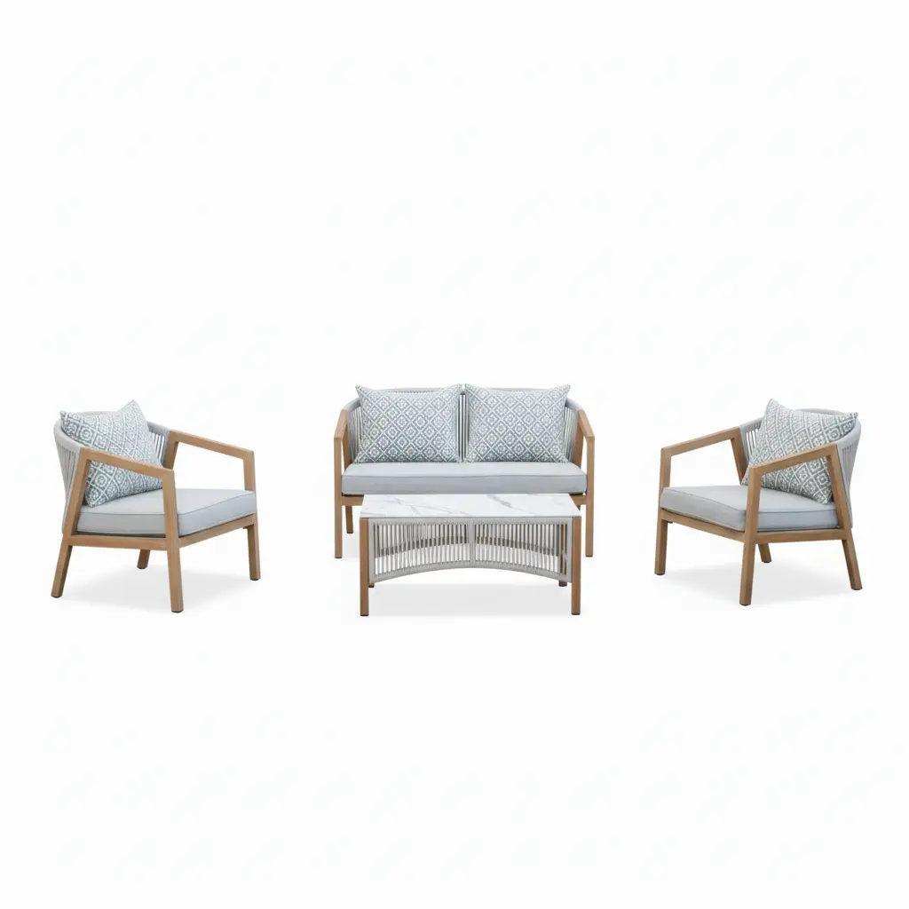 لارنـا من LIVING هو طقم خارجي أنيق يجمع بين الراحة والفخامة في تصميم عصري من الخشب الطبيعي والحبال الرمادية الفاتحة.