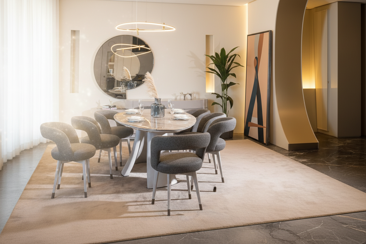 سفرة مودرن بتصميم بيضاوي أنيق تجمع بين البساطة العصرية والراحة، مثالية لغرف السفرة الراقية والمساحات الحديثة.
