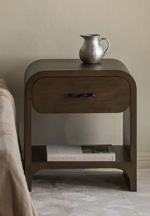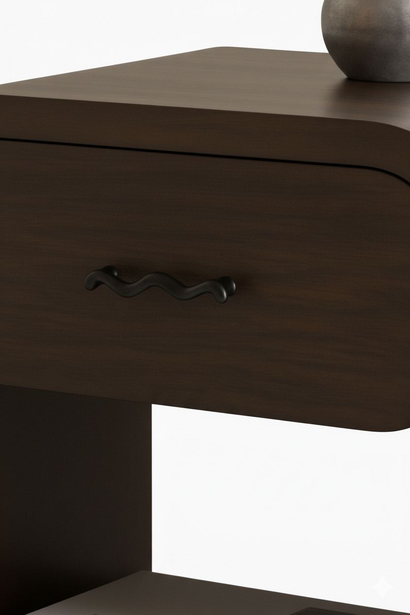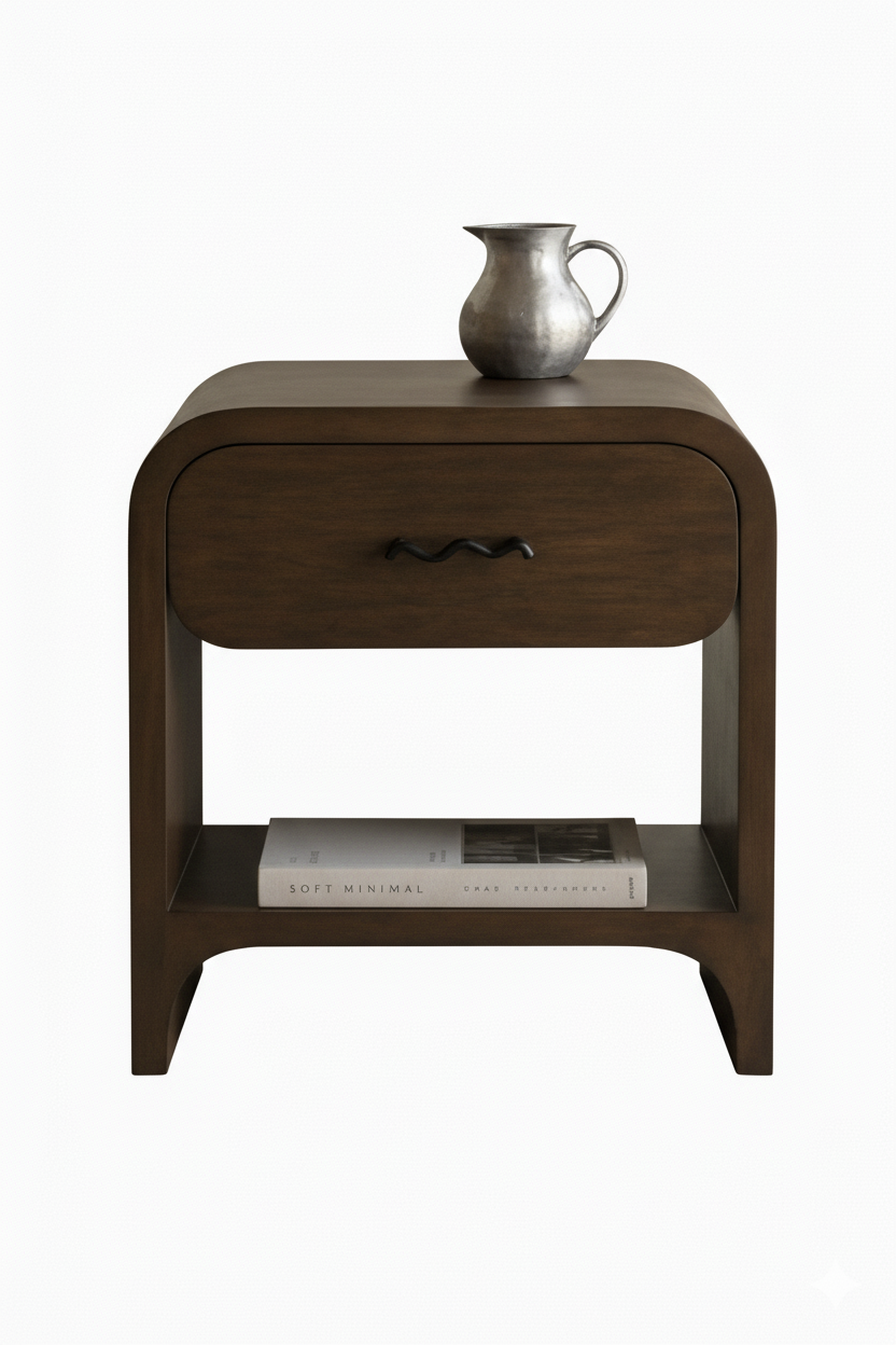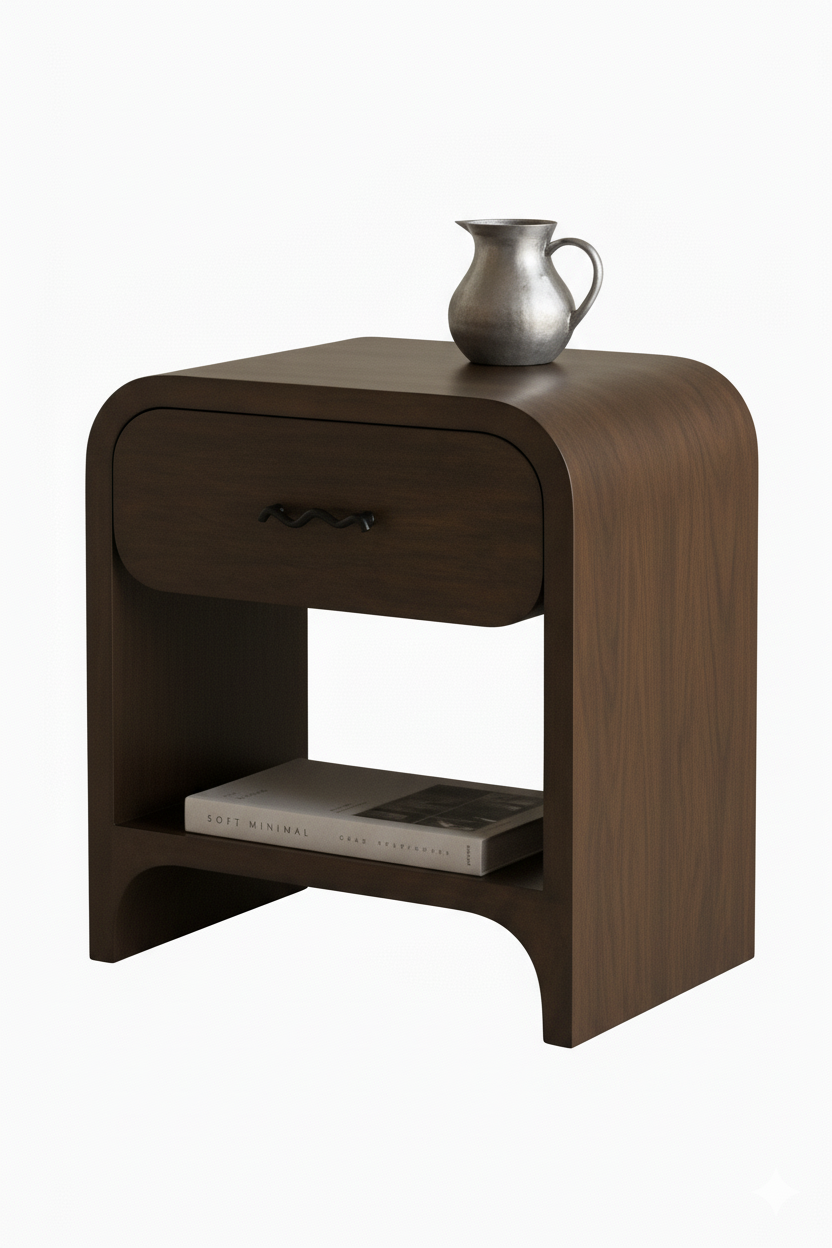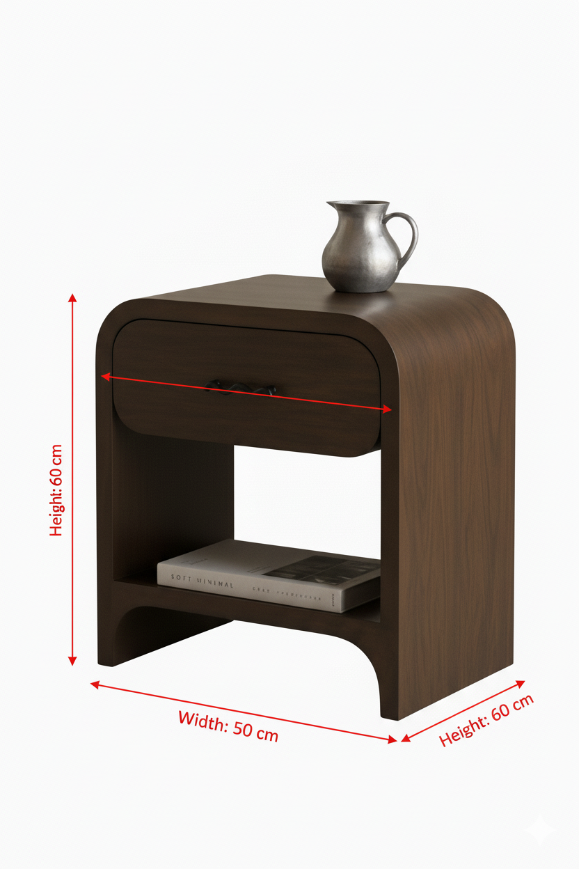 كومود مودرن بتصميم منحني أنيق من LIVING، مصنوع من خشب طبيعي بعرض 50 سم وارتفاع 60 سم، مزود بدرج عملي ورف سفلي للتخزين. مثالي لغرف النوم العصرية.
