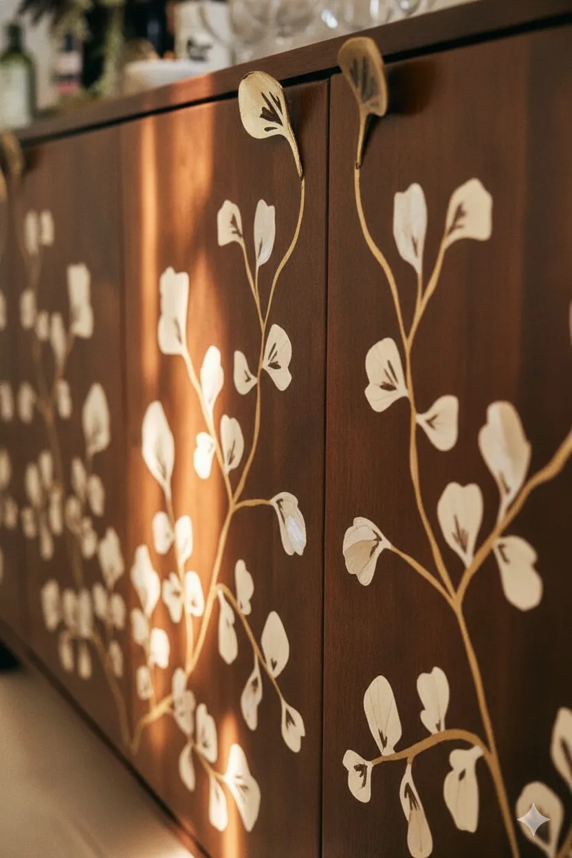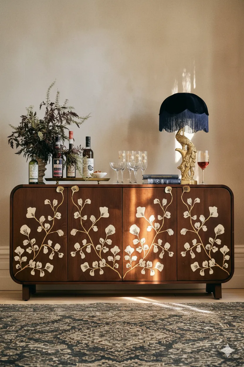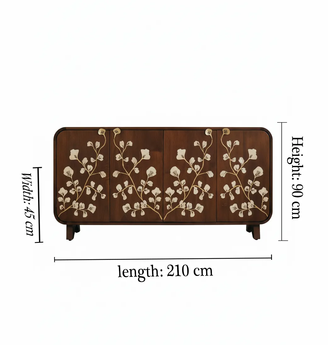 ميلورا وحدة تخزين مزخرفة بتصميم فني أنيق يجمع بين الخشب الطبيعي والزخارف النباتية الراقية، مثالية لغرف المعيشة والسفرات.