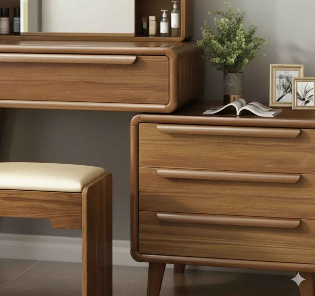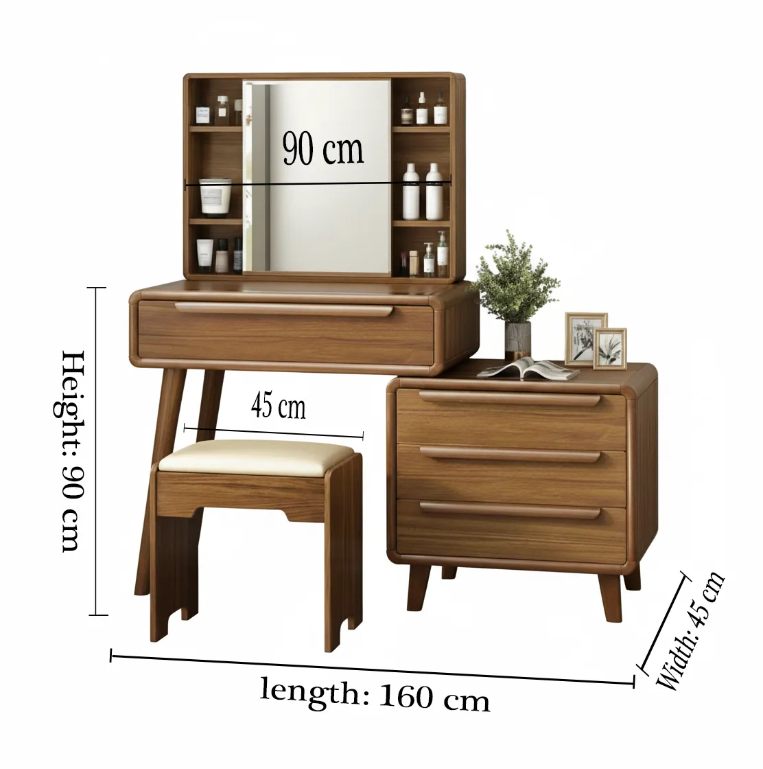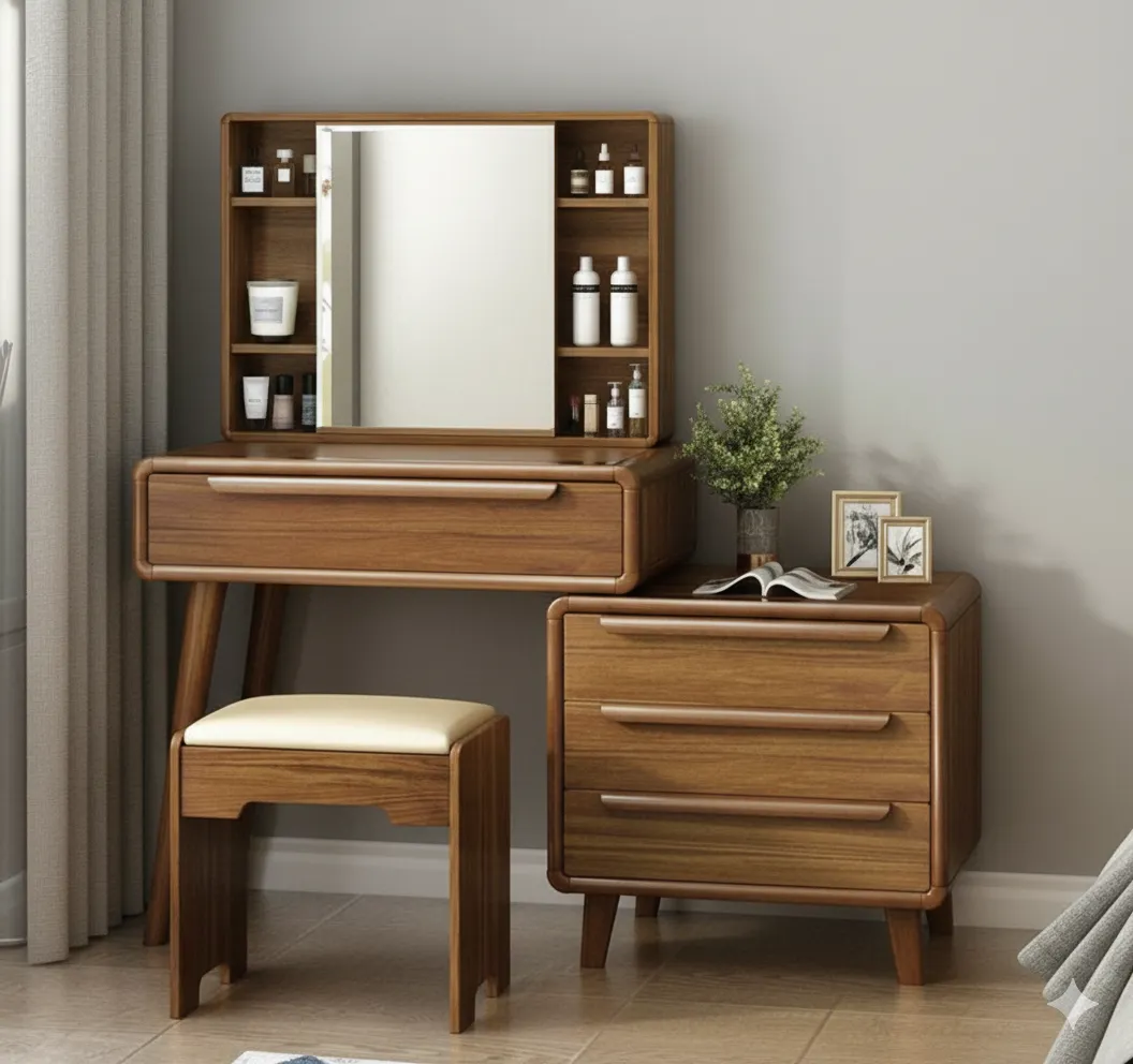 نوريلّا تسريحة خشبية بتصميم عملي ولمسة طبيعية دافئة بعرض 160 سم × ارتفاع 90 سم × عمق 45 سم، مُصمّمة من الخشب الطبيعي بلون بني دافئ، تحتوي على مرآة واسعة بأرفف جانبية لحفظ مستحضرات التجميل، مع مقعد مريح. مثالية لغرف النوم الكلاسيك مودرن وتوفر مساحة عملية للتخزين والاستخدام اليومي.