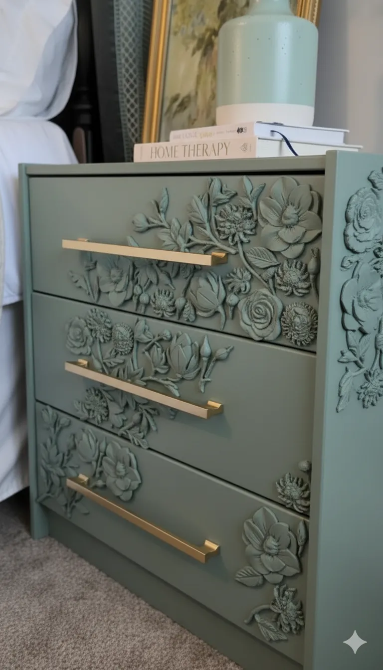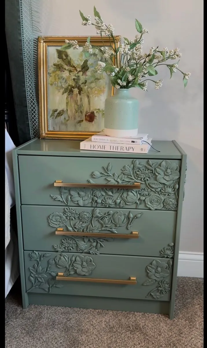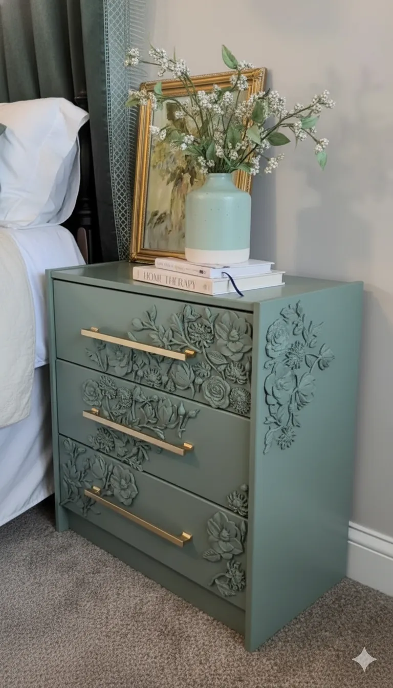 نيروزا وحدة تخزين بتصميم زهري محفور بدقة يمنحها طابعًا فنيًا أنيقًا يلفت الأنظار. تأتي بثلاثة أدراج عملية توفر مساحة تخزين مثالية للأغراض اليومية، مع مقابض معدنية بلون ذهبي تضيف لمسة فخامة متناسقة مع اللون الهادئ للوحدة.