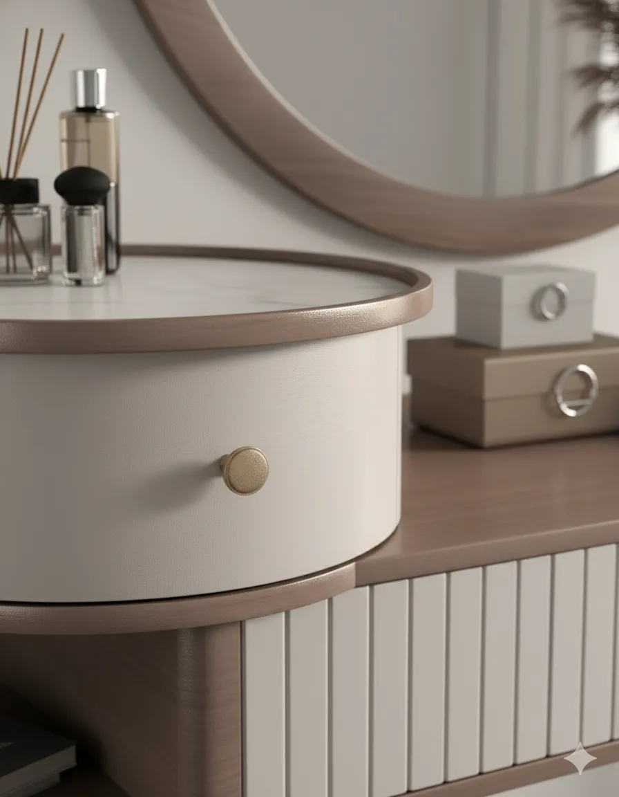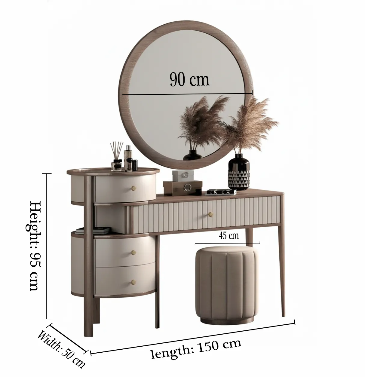 ڤـــاليـــنـا تسريحة مودرن بتفاصيل خشبية وأدراج انسيابية تجمع بين الخشب الطبيعي واللمسات الناعمة، مزودة بمرآة دائرية بقطر 90 سم،